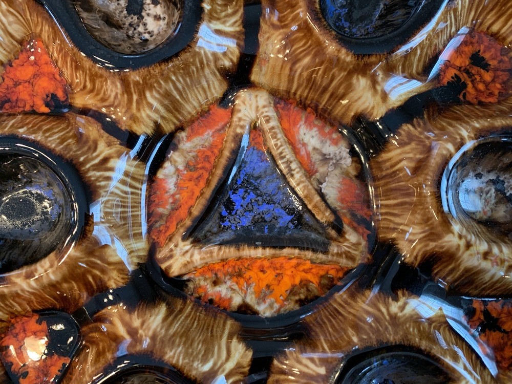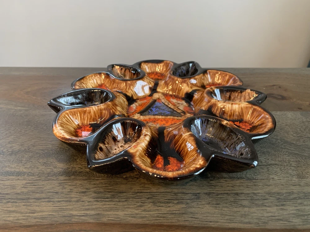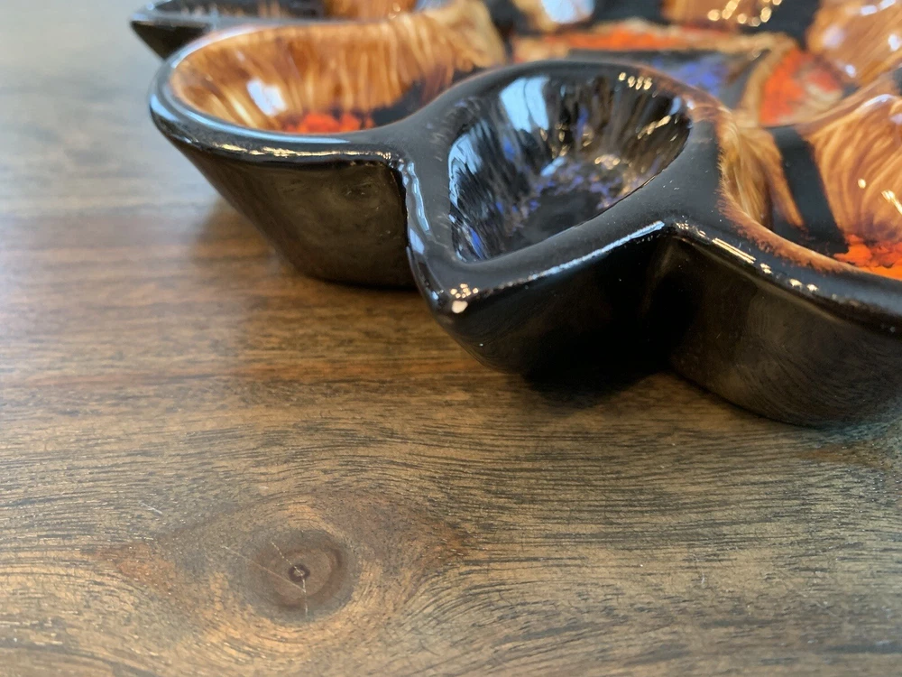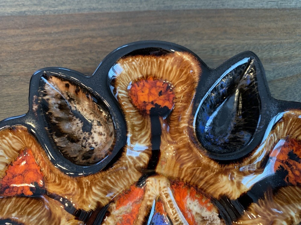 Original handmade decorative plate featuring stunning rich colors. In good condition, shows normal wear consistent with age and use like chips on the rim as depicted in the pictures. Please refer to the pictures as they’re part of the description. Measurements: - Length: 22.5 cm - height: 3.3 cm - width: 21.8 cm - weight: 600 g