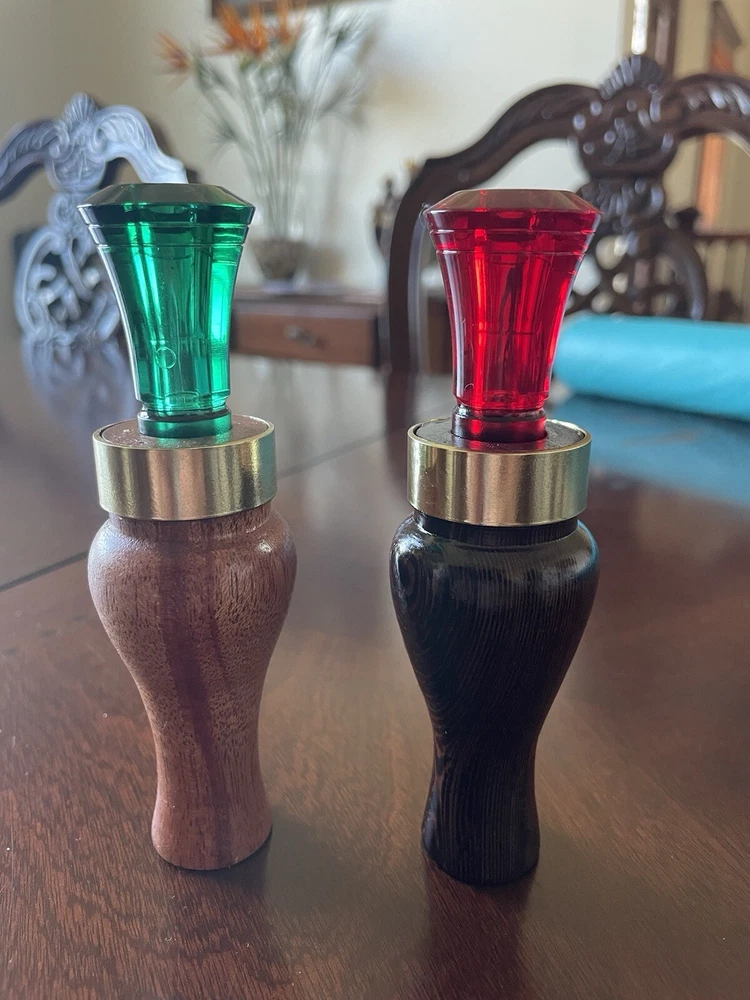 Only the red and dark brown one the other calls are available if you would like one of those instead let me know.Handmade help a kid out and buy please single reed duck call They Sound great just letting you know you’ll be the only one with a handmade call 1 of 1 to your friends and will sound the best out of all of them if your still reading this don’t keep thinking about it just buy it already