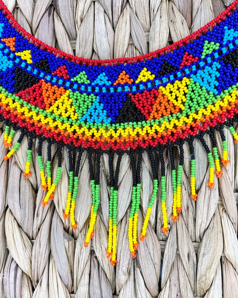 Handmade in Mexico by families in small communities. SPECIFICATIONS Size: 35-45 cm (13.7-17.7 in) x 12 cm (4.7 in) *Each beaded necklace is unique, so the sizes provided are approximate. Includes a versatile elastic hook on one end, ensuring a comfortable and adaptable fit for everyone. This necklace was crafted with elegant crystal beads and delicately woven with soft polyamide thread. CARE Store in the protective bag provided and ensuring they stay dry. Apply your lotion, makeup, or perfume before wearing the jewellery. Do not use during swimming or showering.