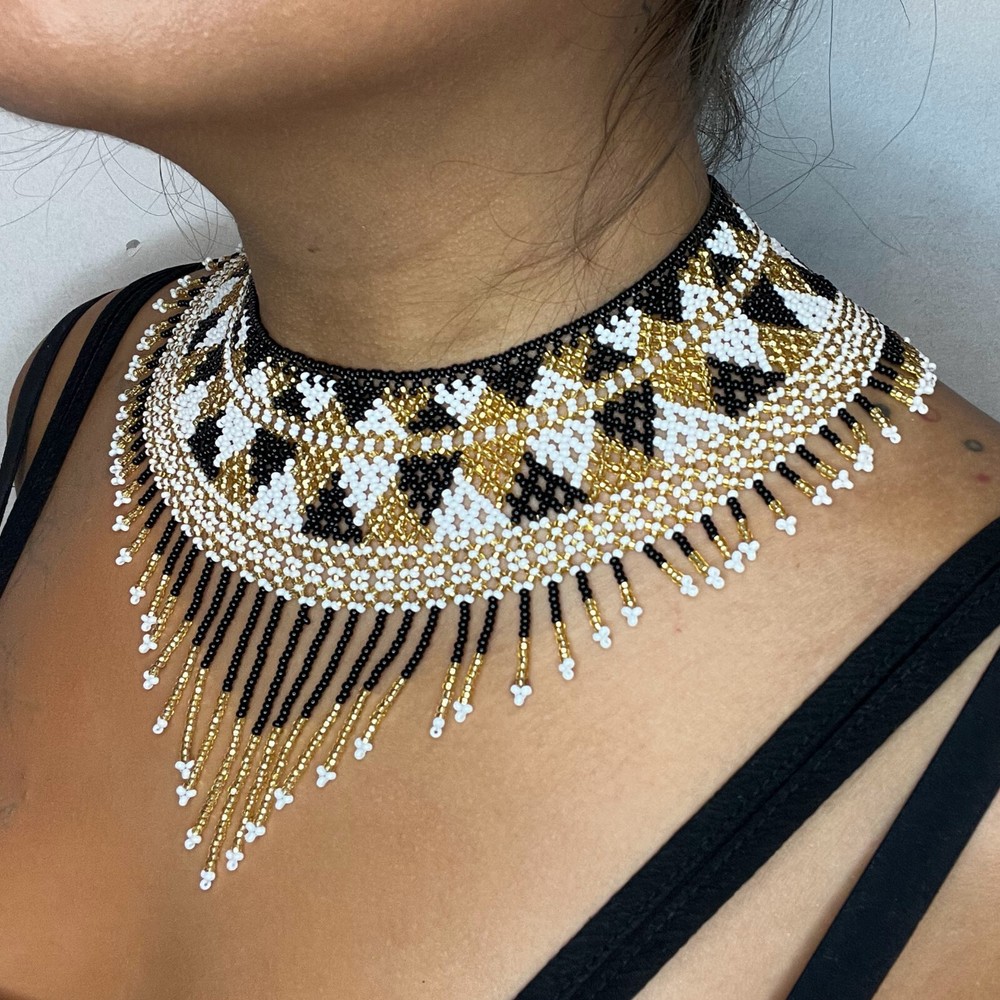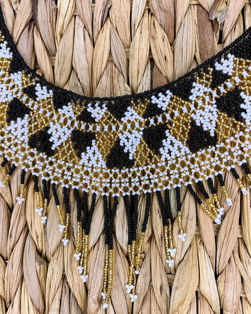 Handmade in Mexico by families in small communities. SPECIFICATIONS Size: 35-45 cm (13.7-17.7 in) x 12 cm (4.7 in) *Each beaded necklace is unique, so the sizes provided are approximate. Includes a versatile elastic hook on one end, ensuring a comfortable and adaptable fit for everyone. This necklace was crafted with elegant crystal beads and delicately woven with soft polyamide thread. CARE Store in the protective bag provided and ensuring they stay dry. Apply your lotion, makeup, or perfume before wearing the jewellery. Do not use during swimming or showering.