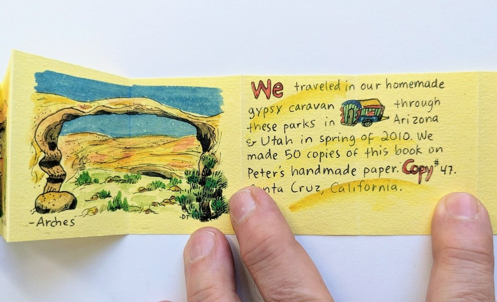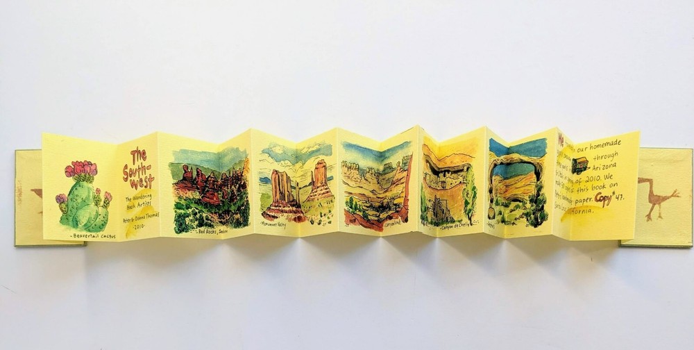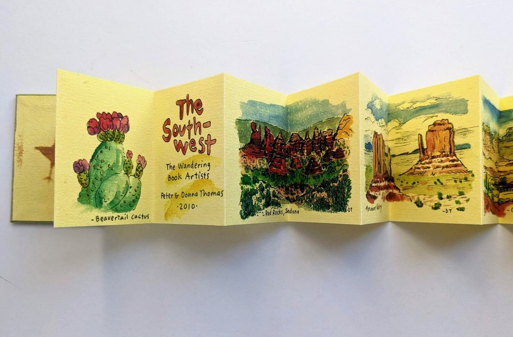 THE SOUTHWEST, by Donna Thomas. A Miniature Book, Published by Peter and Donna Thomas, Santa Cruz, 2010. Handmade Book on handmade paper, #47 of only 50 copies. Hardcovers, 1 3/4 by 2 1/4 inches, 16 accordion pages. A series of watercolor paintings of landscapes that Donna Thomas painted in National Parks during a trip taken through the Southwest by Peter and Donna Thomas during their "wandering book artist's gypsy wagon trip through Arizona and Utah in the Spring of 2010, and reproduced by her on these pages." Fine condition.