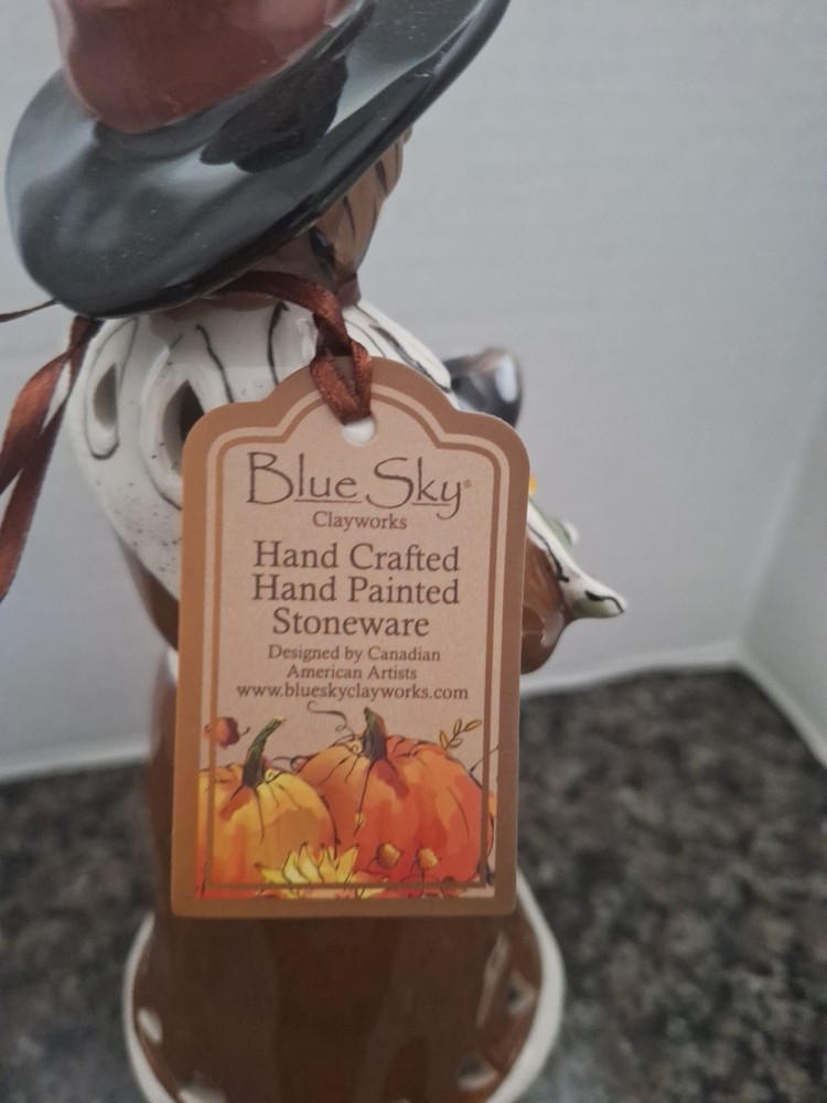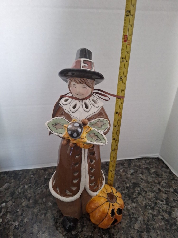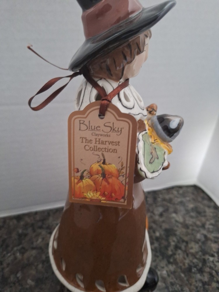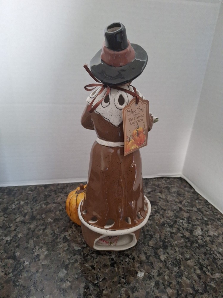 Color:BlueNew:New with TagObject:Tealight HolderSubject:Pilgrim w/ PumpkinModified Item:NoHoliday:ThanksgivingYear:2010Handmade:YesPersonalize:NoCountry/Region of Manufacture:United StatesArtist:Heather GoldmincMaterial:PorcelainSize:11' Tall x 5.5' WideOccasion:Thanksgiving