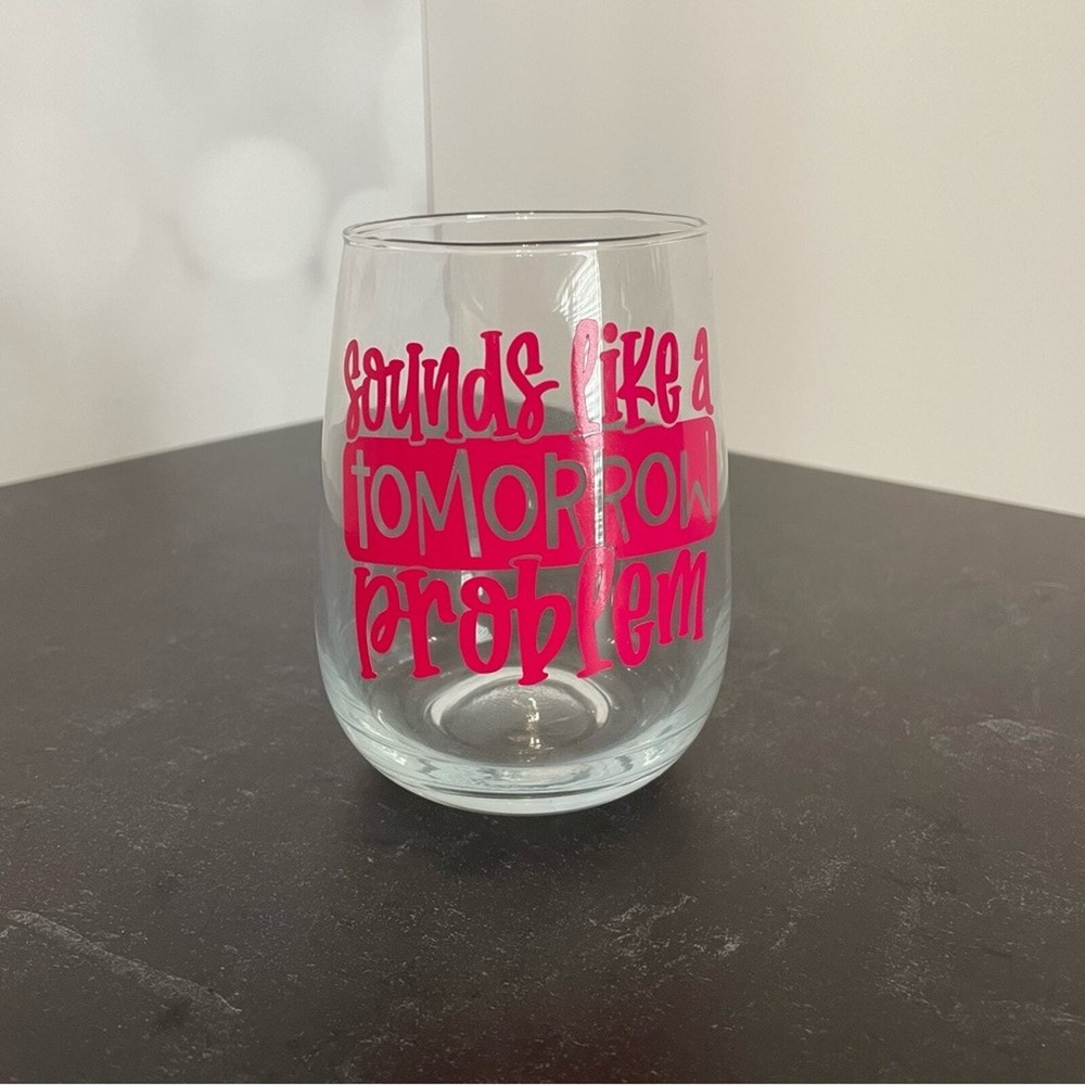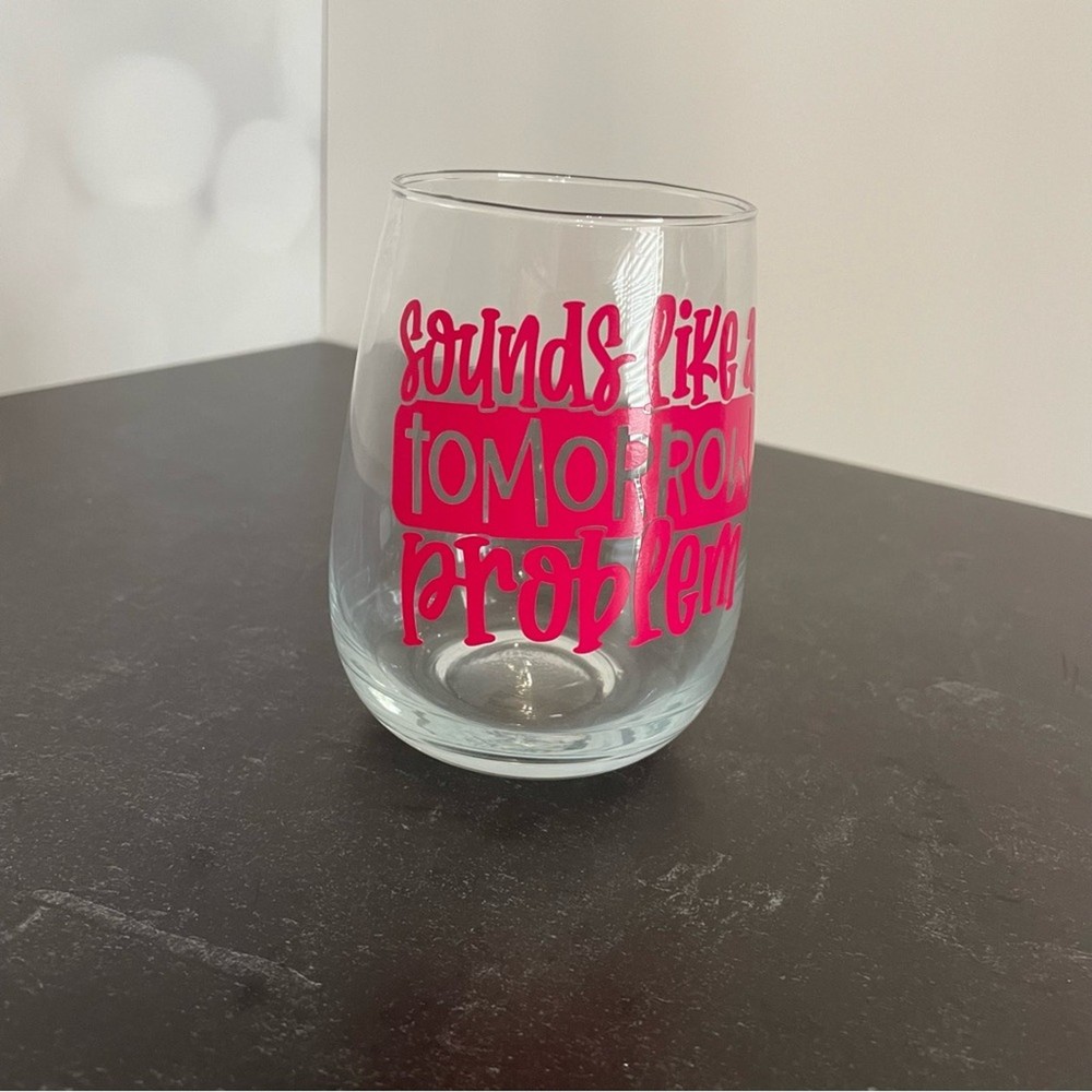 New “Sounds Like a Tomorrow Problem” Handmade Vinyl Wine Glass Design Stemless Pink (looks red, but it’s a darker pink) Hand wash only Narrow rim and slender bowl preserves aromas Graceful stemless shape is easy to hold Size 17oz *Can make in other colors, just make a request*