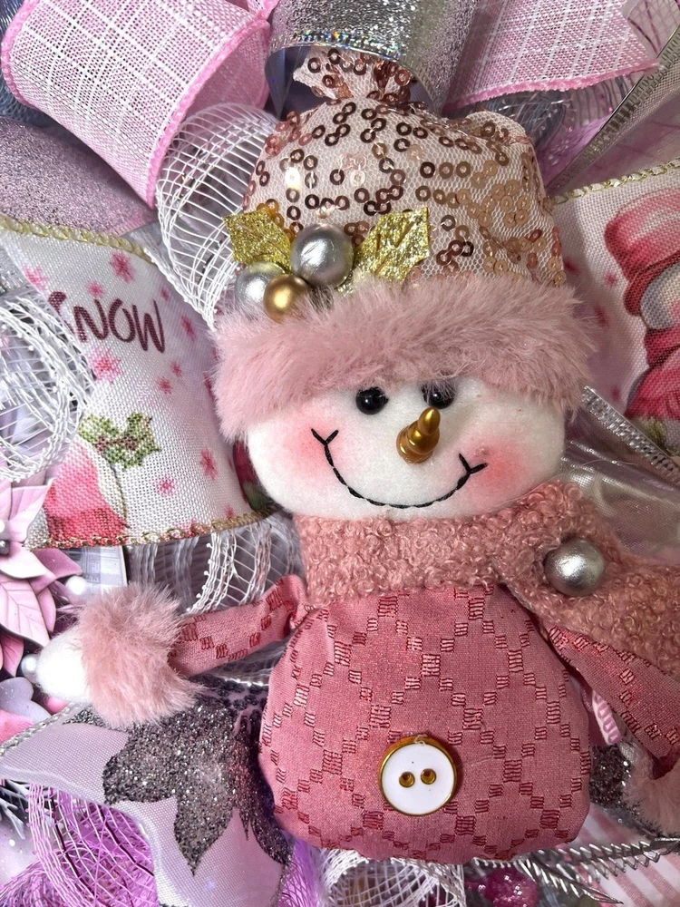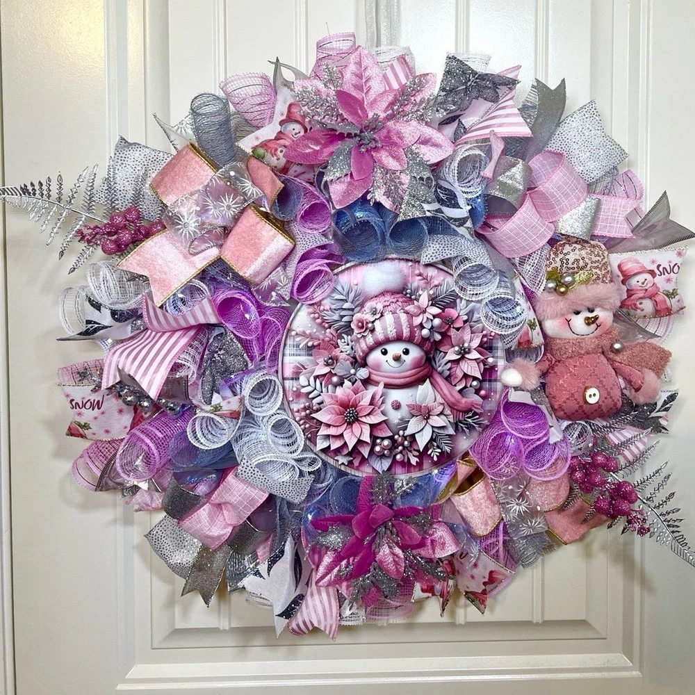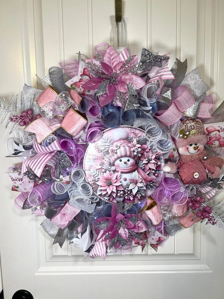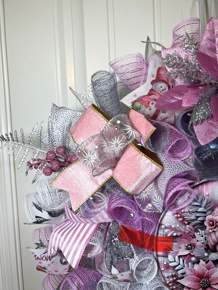 About 22 inches, 5 inch-deep door or mantle wreath. Pink, White, and Silver mesh back. December/ Christmas themed w/ vibrant multi color wired ribbons (9 styles). Has a Pink Snowman/ Poinsettia wooden sign, a mini plush, glitter berries, faux poisettias and silver leaf spray adorn this wreath This wreath is built on a 14 frame. Perfect for decorating your home for Winter/ December Holidays/ Christmas . Fitted with 20 LED lights to illuminate at night; 3 modes. Wreath made in a smoke free environment. Wreath can be displayed either indoors or outside. However, for optimal durability please avoid direct sunlight and harsh elements. Ships in a sturdy box that will be closer to frame size. On arrival you may need to fluff ribbons and bows so it will be ready to beautify your door or mantle. Please be aware, deco mesh has a tendency to fray at the edges. Simply trim any loose strands to preserve the beauty of the wreath. W80Ch13D218939COP
