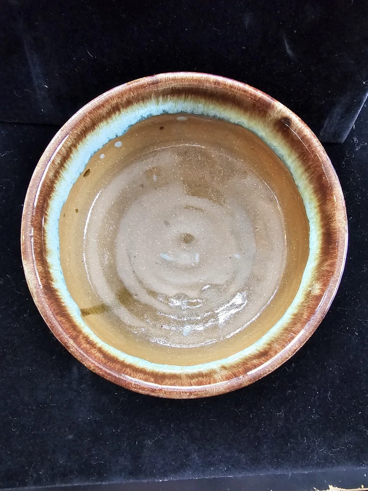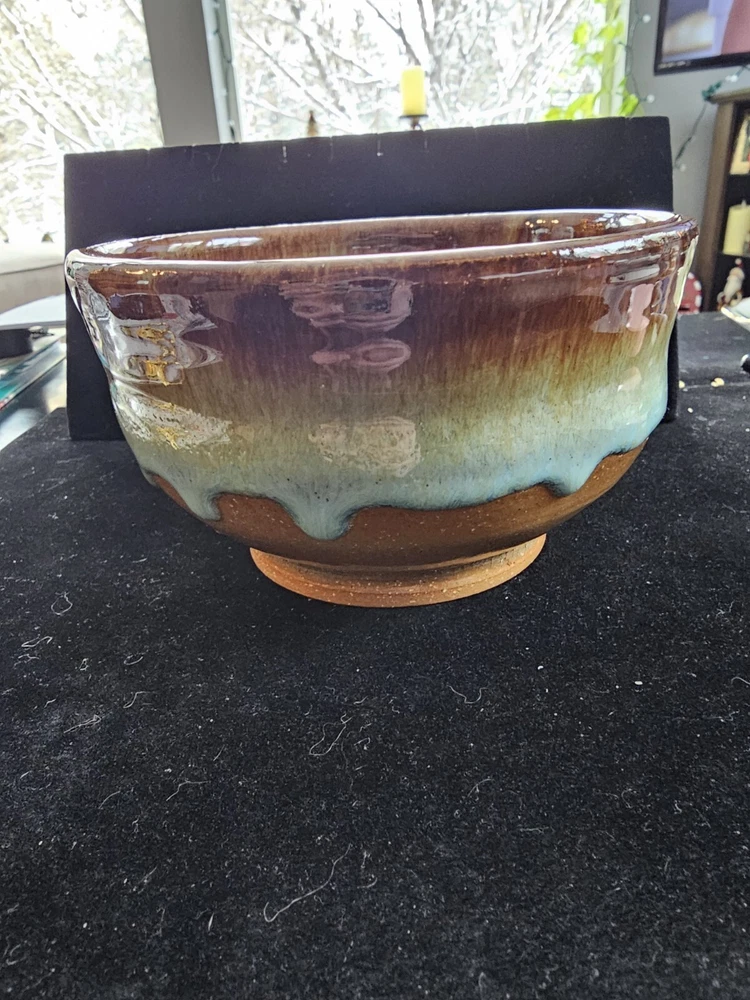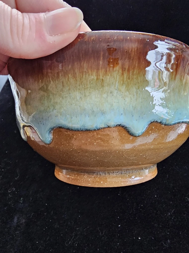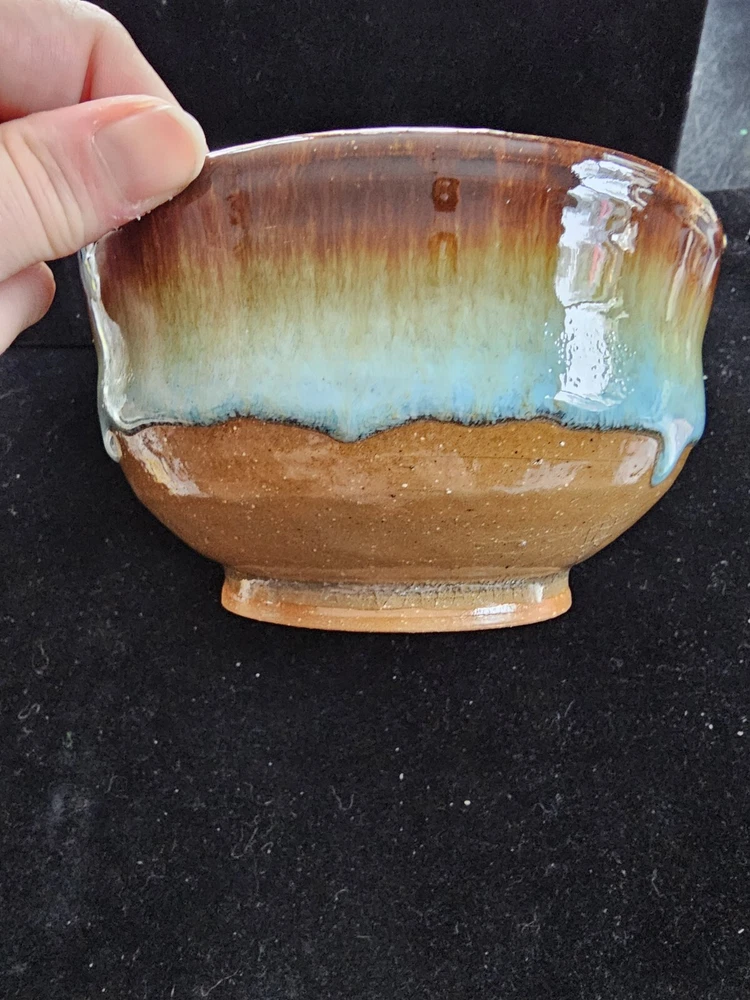 This is a handmade pottery bowl dish with a multicolor glossy finish. It is 5.5 inches in diameter and 3 inches deep, with a height of 3.5 inches. The bowl is made of clay using a pottery production technique and is intended for all occasions. It is recommended to hand wash only. The brand is handmade, and it is an original piece.