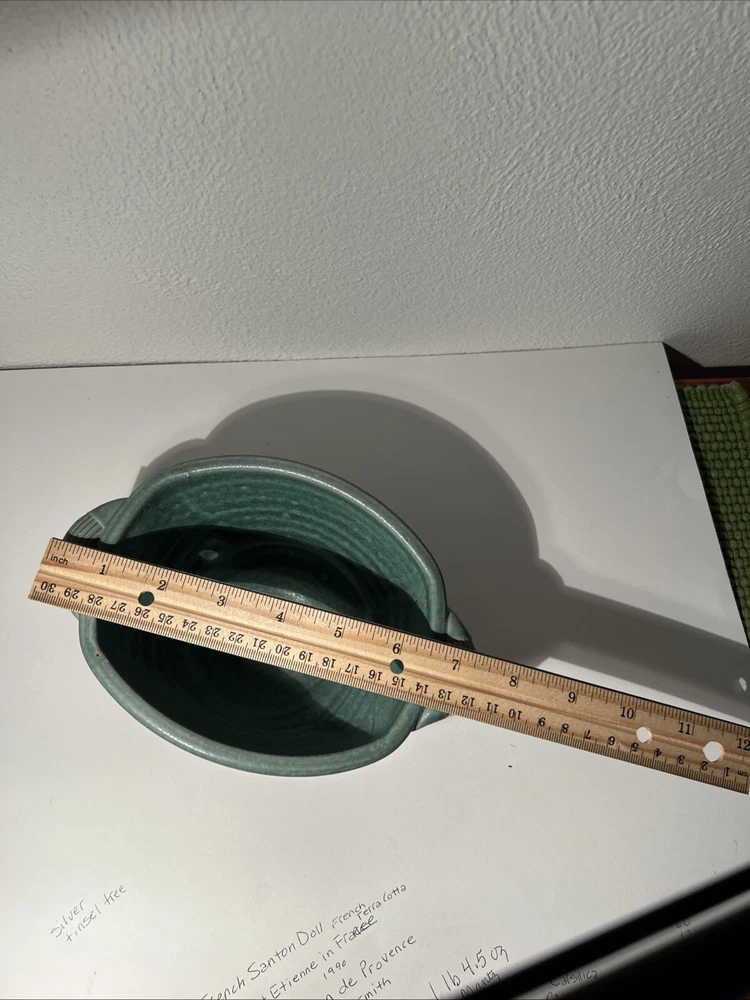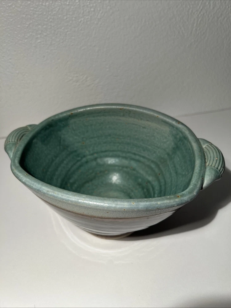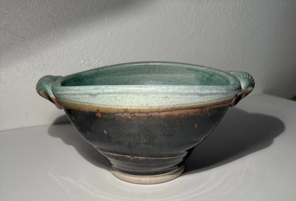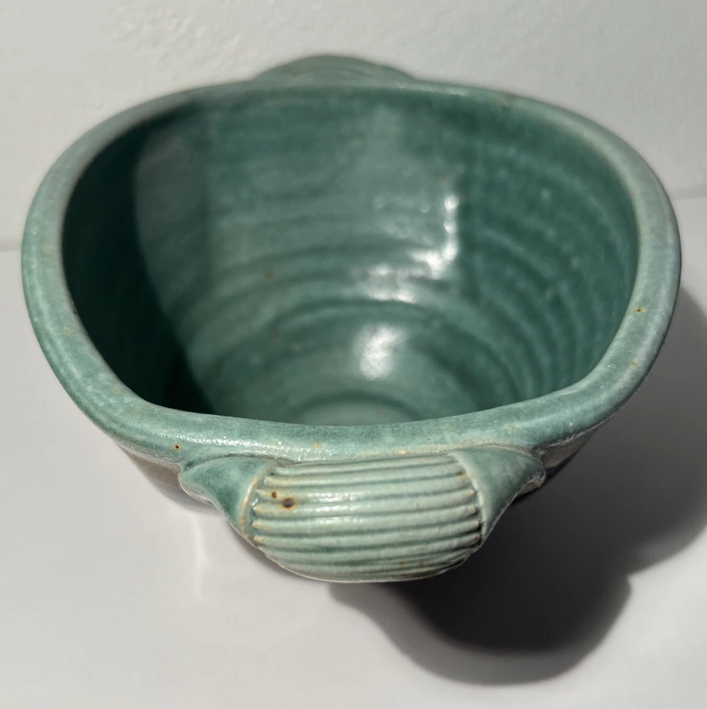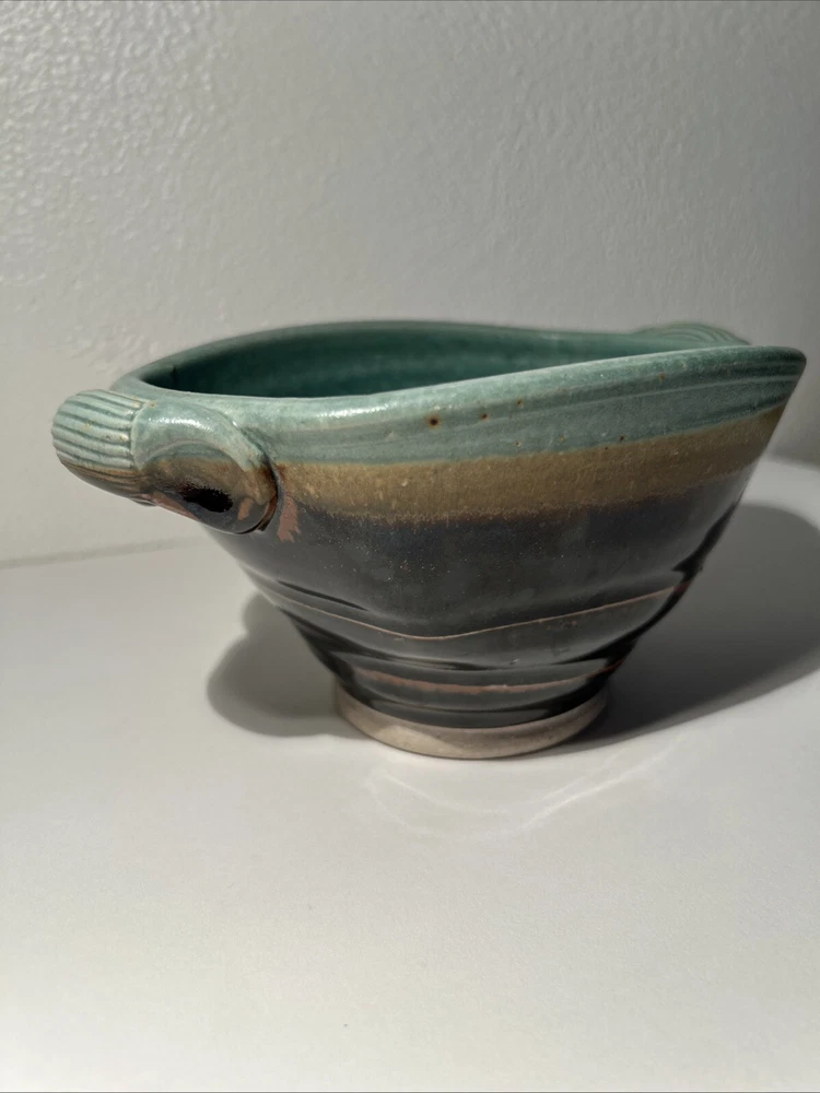 This is a handmade pottery bowl originating from North Carolina. It is an original piece, not a reproduction, with a production technique of pottery. The bowl has a mixed matte and gloss finish, showcasing a unique design. Measuring 3.5 inches in height and 7.25 inches in length, it weighs 1lb 3oz. This vintage-inspired piece adds charm to any kitchen or dining setting with its artisanal craftsmanship.
