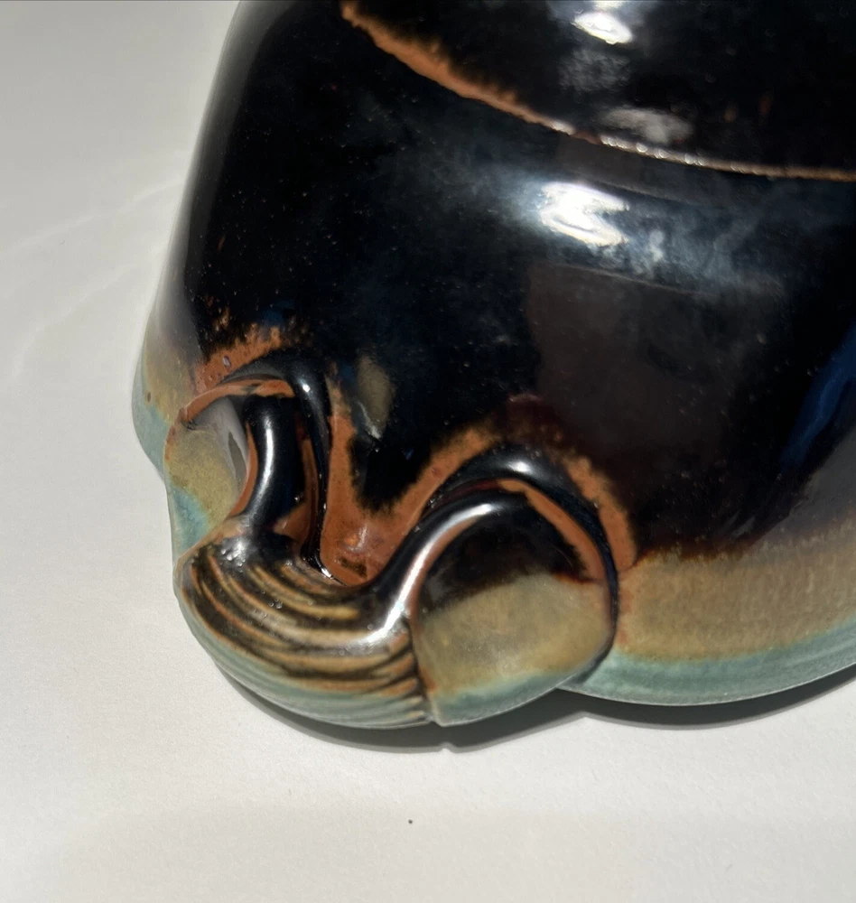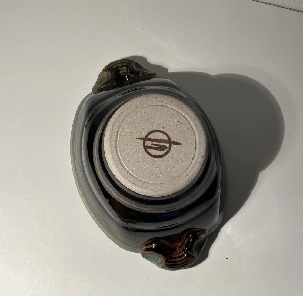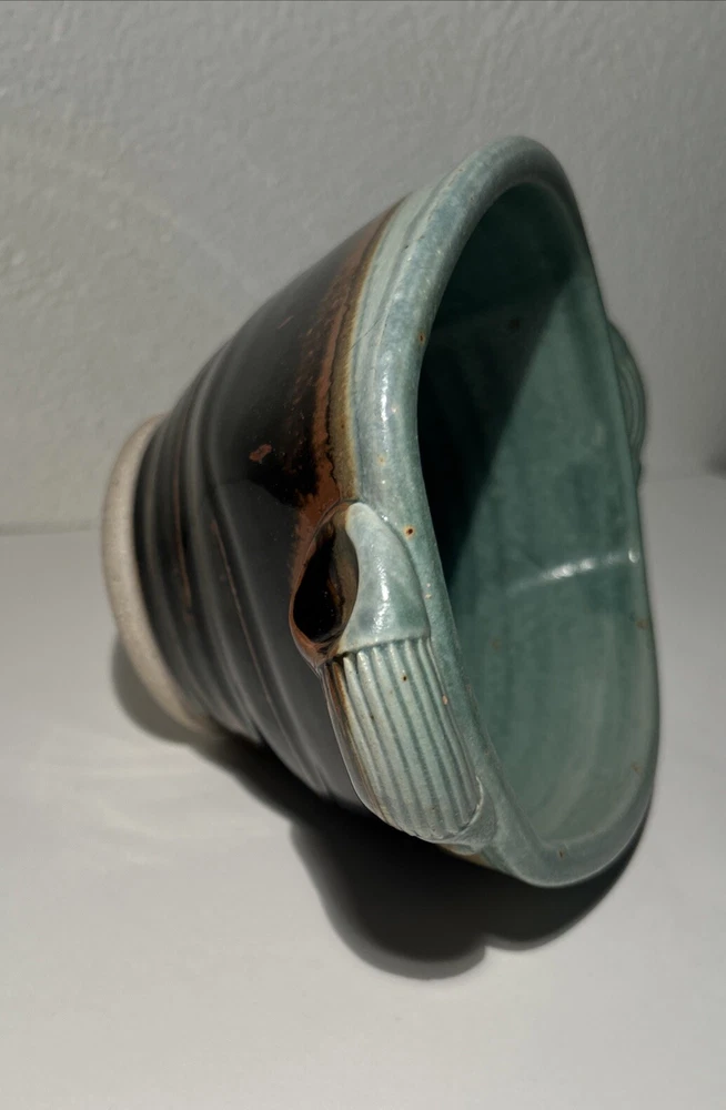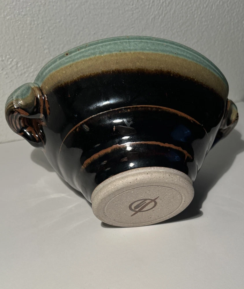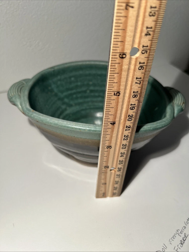 This is a handmade pottery bowl originating from North Carolina. It is an original piece, not a reproduction, with a production technique of pottery. The bowl has a mixed matte and gloss finish, showcasing a unique design. Measuring 3.5 inches in height and 7.25 inches in length, it weighs 1lb 3oz. This vintage-inspired piece adds charm to any kitchen or dining setting with its artisanal craftsmanship.