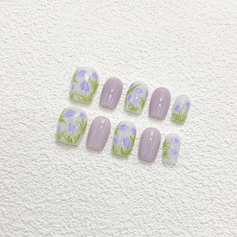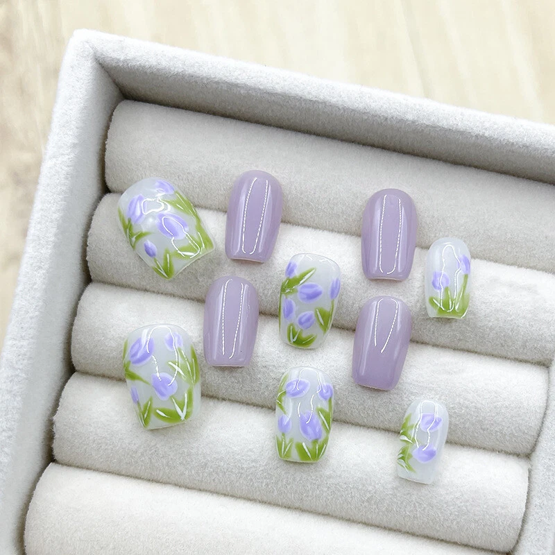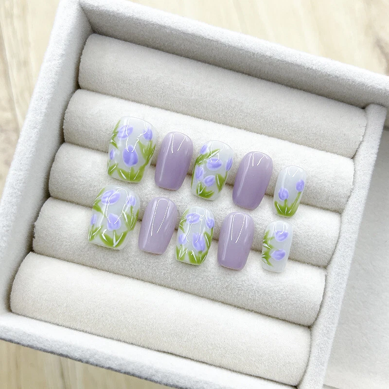 Handmade Purple Tulip Daily Flase Nail Short Coffin Press on Nail for Nail Art