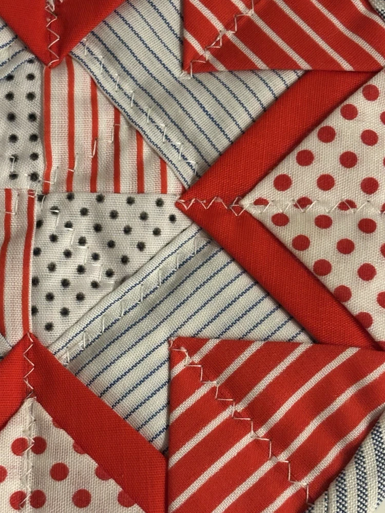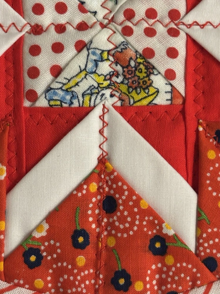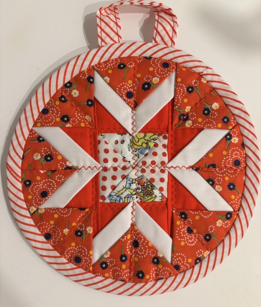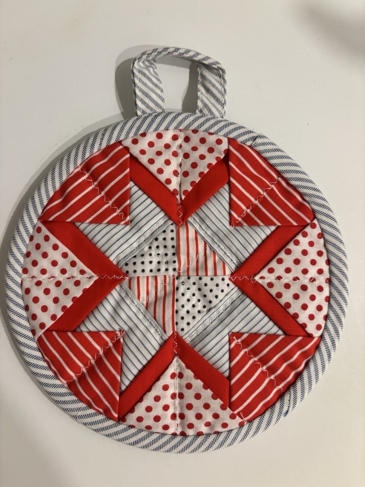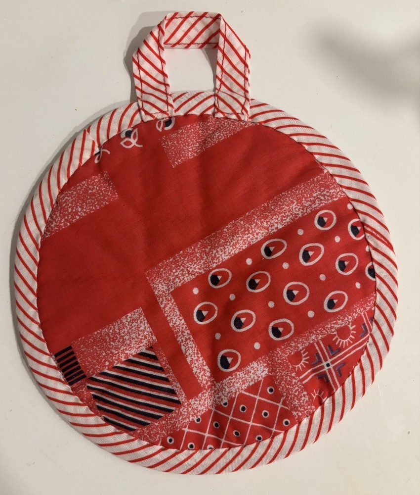 Pair of handmade quilt potholders with loop for hanging. Multicolored with red as the primary color. The measure approximately 7” in diameter. New.