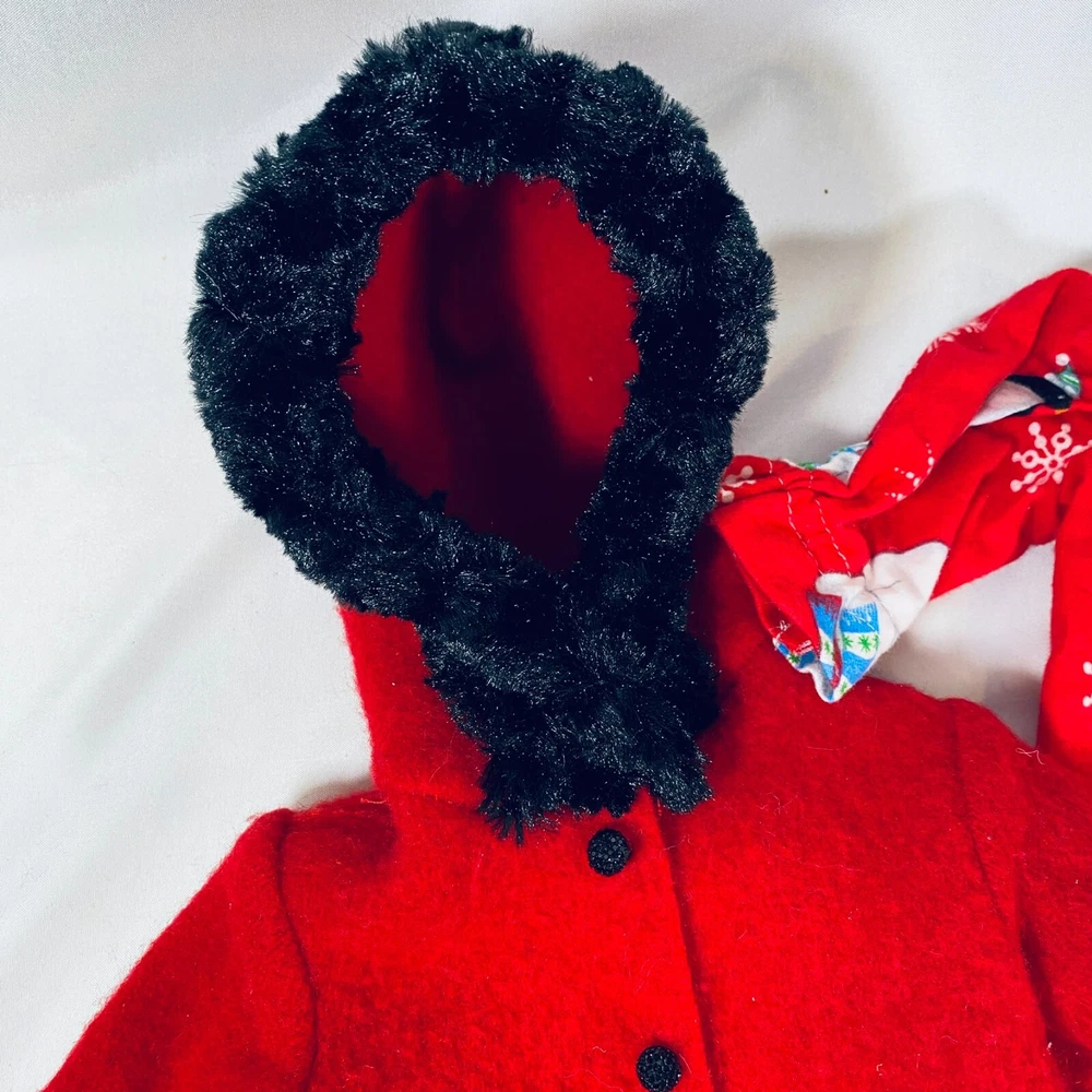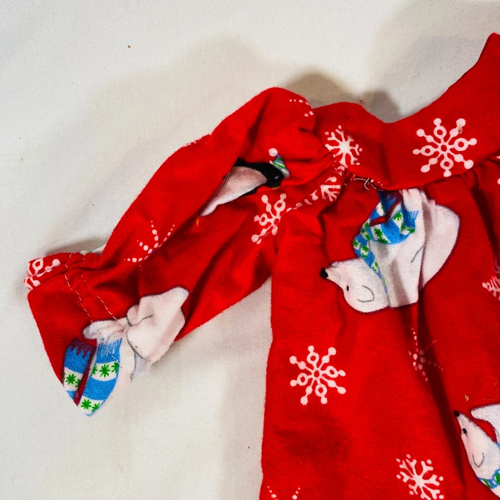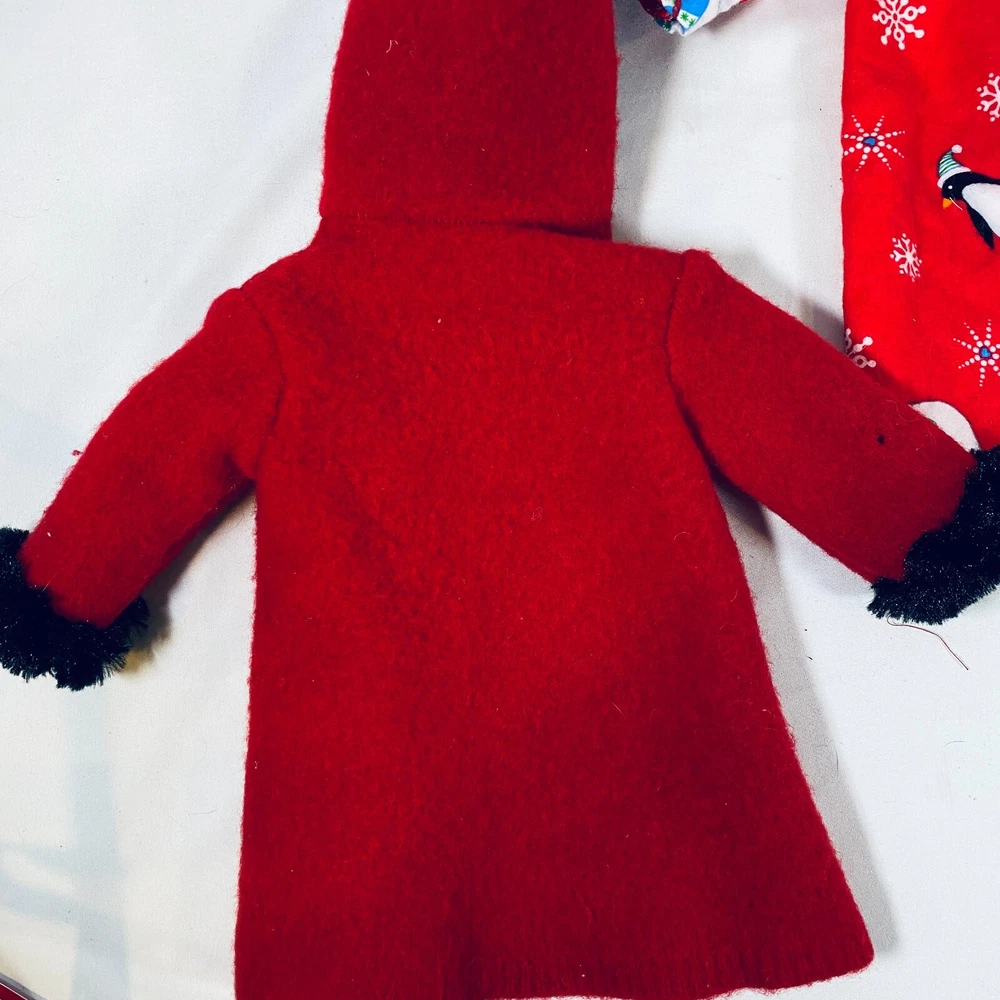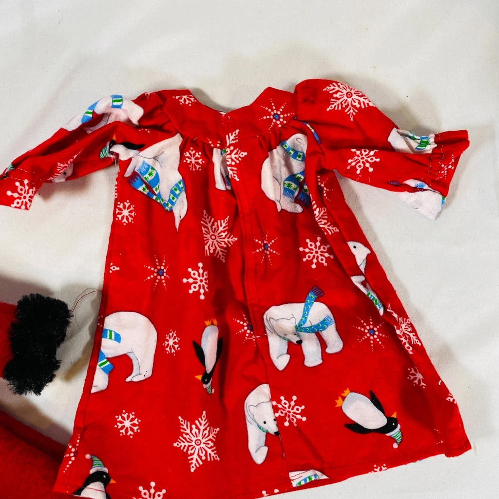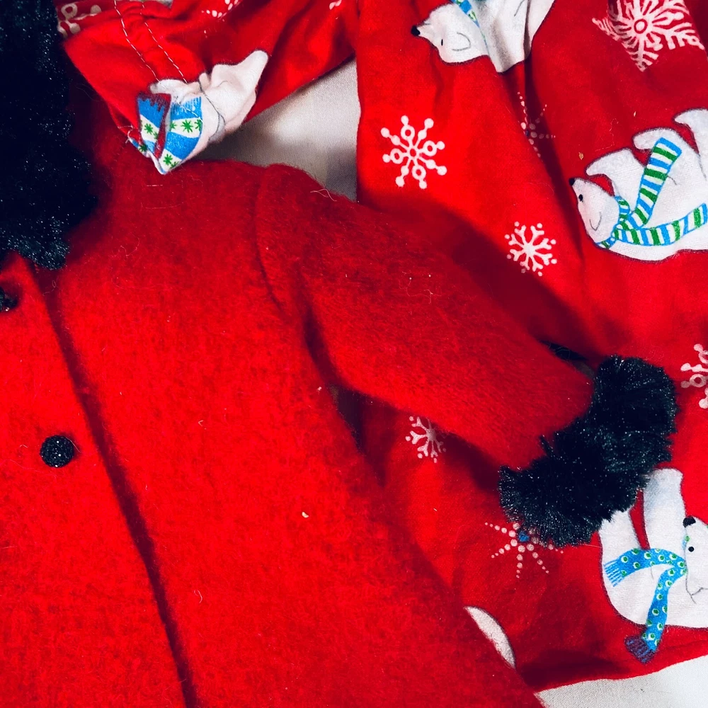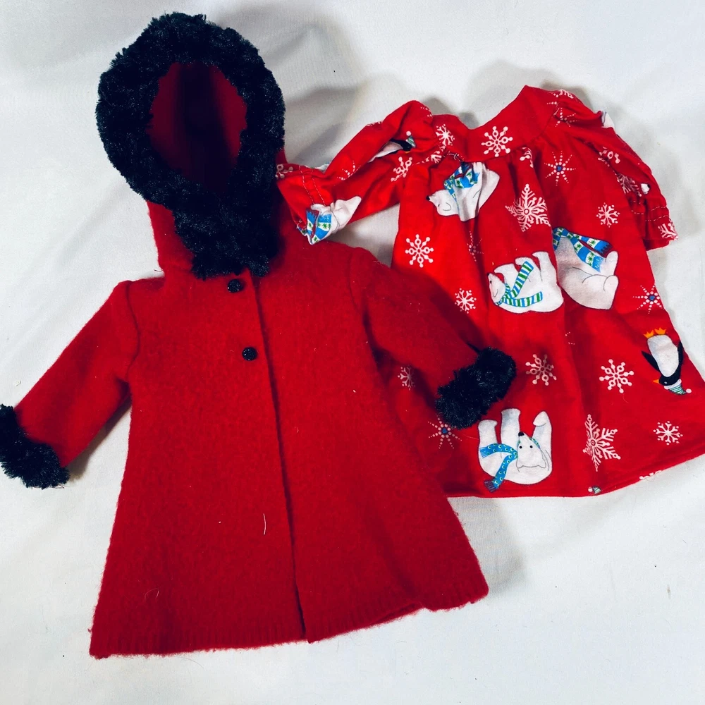 Handmade Clothes for 18" American Girl Doll or Similar. Includes thick red winter coat with black fur trim, and polar bear print flannel nightgown. Both nicely made, simple but with pretty details like functional buttons on the coat. In gently played with condition, coat has some pilling and a small hole on one sleeve as pictured, no flaws noted on nightgown. Please see all pictures for exact cosmetic condition and other details, and ask any questions before purchasing. We are a husband and wife team with a growing family, and greatly appreciate your support of our small business. Please browse our eBay store for a variety of other American Girl items. We hope you enjoy this outfit!
