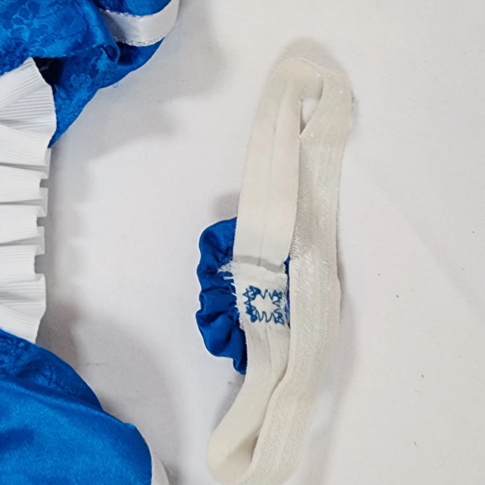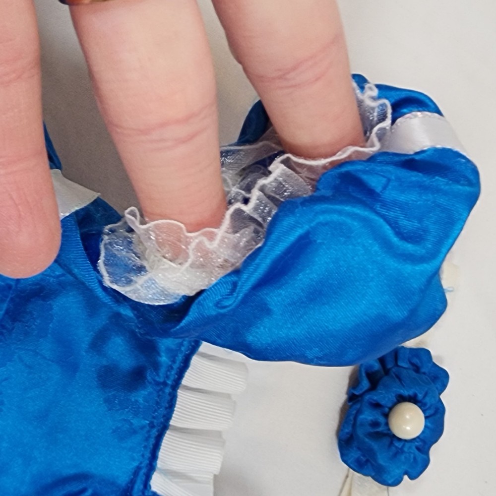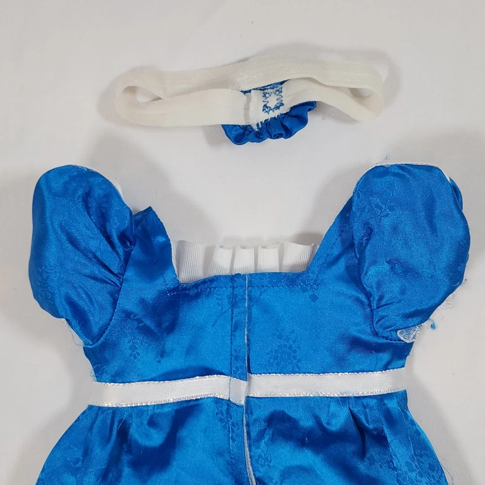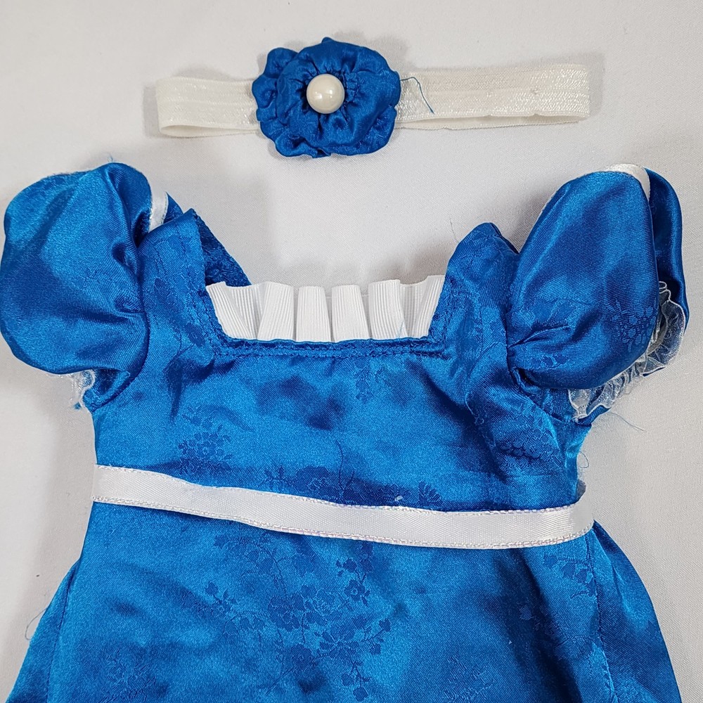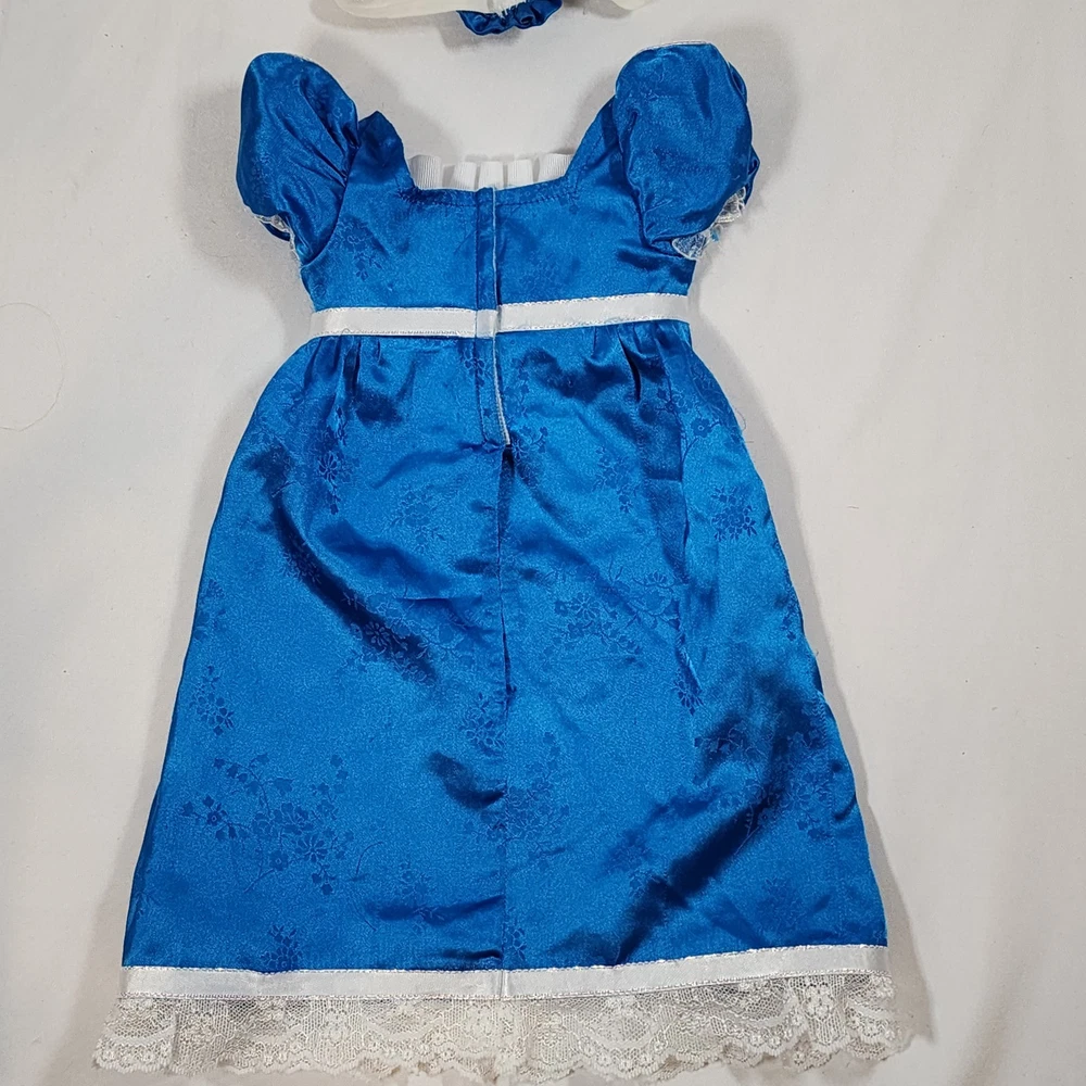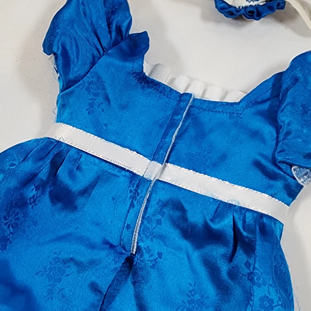 Handmade Regency Era Outfit for 18" American Girl Doll Caroline. Appears to be a replica-style or at least inspired by Caroline's Blue Party Dress Outfit. Includes blue satin dress with attached ribbon sash at waist, ruffle at neck, and a beautifully detailed lace trim at hem, as well as a a coordinating headband. Beautifully seamstress-made with precision and detail, velcro closure in back, all seams are finished. In excellent condition, some minor snags/runs as pictured, as material is quite delicate (similar to the original outfit). Please see all pictures for exact cosmetic condition and other details, and ask any questions before purchasing. We are a husband and wife team with a growing family, and greatly appreciate your support of our small business. Please browse our eBay store for a variety of other American Girl items. We hope you enjoy this set!