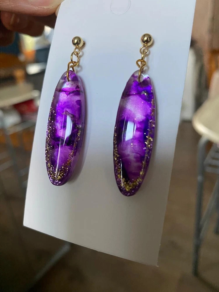 Add a touch of unique elegance to your ensemble with these handcrafted resin earrings, boasting an oval shape that complements their tassel style. The vibrant purple hue is accentuated by the warm glow of yellow gold plating, creating a striking contrast that's sure to turn heads. Designed for the lobe, these unbranded earrings are a testament to bespoke fashion, marrying craftsmanship with contemporary design. Each pair is unique, confirming your style as individual as you are. Whether it's for a special occasion or to add a sparkle to your everyday wear, these earrings are a subtle yet sophisticated choice.