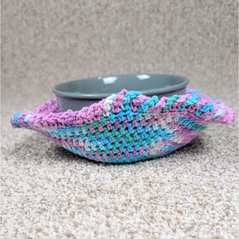 Bowl Hot Pad - Orchid/Beach Ball 2 layer crocheted bowl cozy 100% Cotton 10" wide at top x 4" tall, 4" diameter on bottom Works great as a pot holder for hot bowls straight from the microwave From Smoke Free/Cat Friendly Home - Cats are not allowed to play with yarn Keywords: crochet bowl cozy, handmade bowl cozy, reversible bowl cozy, hot pad, bowl holder, purple bowl cozy, blue bowl cozy, unique kitchen decor, handmade kitchen, gift idea, housewarming gift, table decor, kitchen accessory, bowl mat