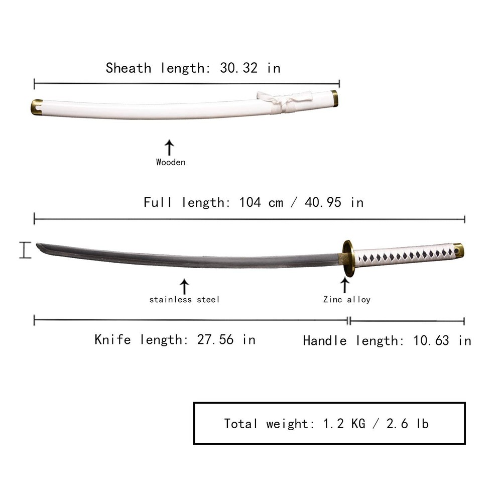 ☞Exquisite replica: Roronoa Zoro Original Texture, Wado Ichimonji is made of high-quality steel material, which is durable and won't cause any harm, can withstand greater impact and pressure and is not easy to be damaged, and has excellent wear resistance and corrosion resistance and a longer service life. More beautiful appearance, more attractive visual effects. ☞Regular version parameter: Overall Length: 40.9 in; Knife length: 27.5 in; Handle length: 10.6 in; Knife width: 1.1 in; Knife thickness: 0.2 in; Total weight: 2.6 lb; Net weight: 2 lb(without scabbard) ☞Lightweight and easy to carry: which is a very practical and convenient choice. The solidity of steel knives is more suitable for actual combat and can provide better defense effect. Perfect for collecting decorations or role-playing, and a great gift for fans. ☞Animation props are designed for role-playing or collection. The ordinary version of the sword has not been heat treated, so it is not sharp.If you want to buy a sharp version, you can search AISN: B0B1ZTPJS8, please choose according to your preference. ☞The quality of "" is guaranteed. Not only exquisite workmanship, but also high reducibility and high safety. We also provide customers with the best after-sales service. If you have any questions, please feel free to contact us, and we will try our best to solve any problems you encounter.