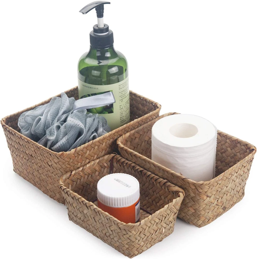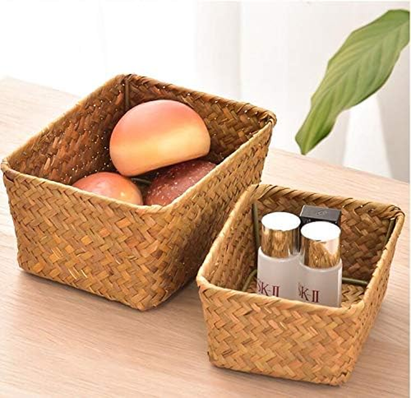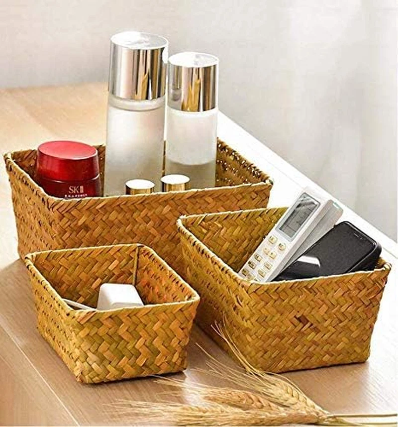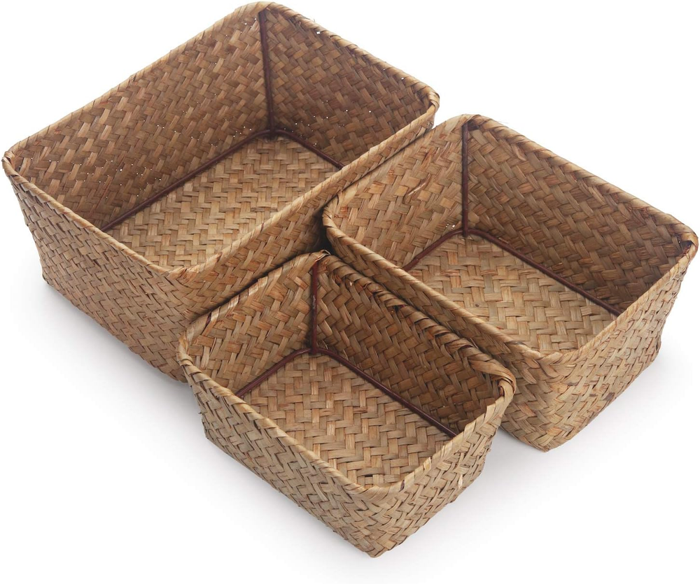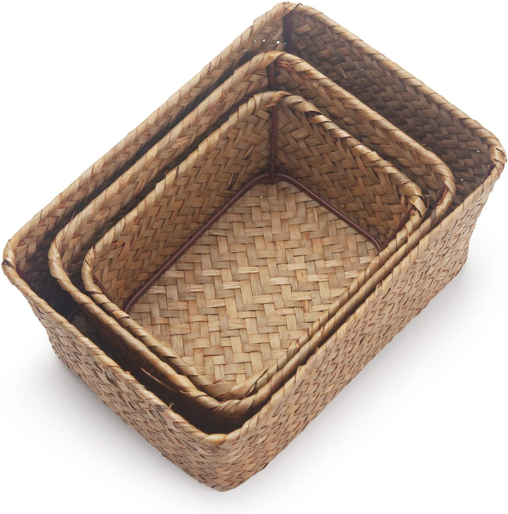 Material: 100% Natural Seagrass with sturdy iron frame, combine practicality with classic appearance perfectly. Unique handwoven design for you. Save Space: Varying size of 3 storage baskets save much space by storing a range of small household items, keep your home shelves organized. Multiple Functions: Set of 3 storage baskets for your bedroom bathroom, kitchen or anywhere in your house, add a natural elegance and warmth feeling to your home. Package Include: Set of 3 pieces(S+M+L). Size: L: 8.3"x4.3"x3.7", M: 6.7"x5.1"x3", S:5.9"x4.3"x2.4" (These products are handmade, please allow deviations within 1 inch). Customer Service: If your item damaged when arrive or has any other questions, please contact us by e-mail. Trust your choice. Product Description Storage Basket Sizes: 3 sizes could be stacked in each other Large: 8.3"x4.3"x3.7" Medium: 6.7"x5.1"x3" Small: 5.9"x4.3"x2.4" DOKOT Rectangular Seagrass Storage Baskets Specifications: Material: 100% seagrass material Function: The Storage Baskets could hold big or small things, makes your home tidy and clean. Package include: Set of 3 (Large+Medium+Small) Customer's satisfaction is our mission These products are handmade, please allow deviations within 1 inch. If you received with any problem or has any other questions, please just let us know. Simple design suitable for anywhere in your house, add a natural elegance and warmth feeling to your home Kitchen Could be use on kitchen taptop to store snacks, spices, canned foods, coasters or bottles. Bedroom Could be use in bedroom to organise cosmetics, personal cares, remote controls or phone chargers etc. Living Room Could be used in living room to hold small stuffs or small planters, keep your room neat and clean. Small size baskets, easy to place any corner of the house and could be stacked for storage