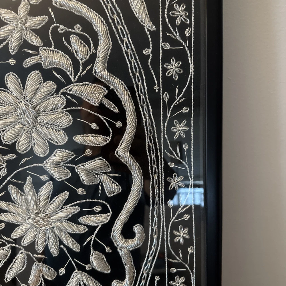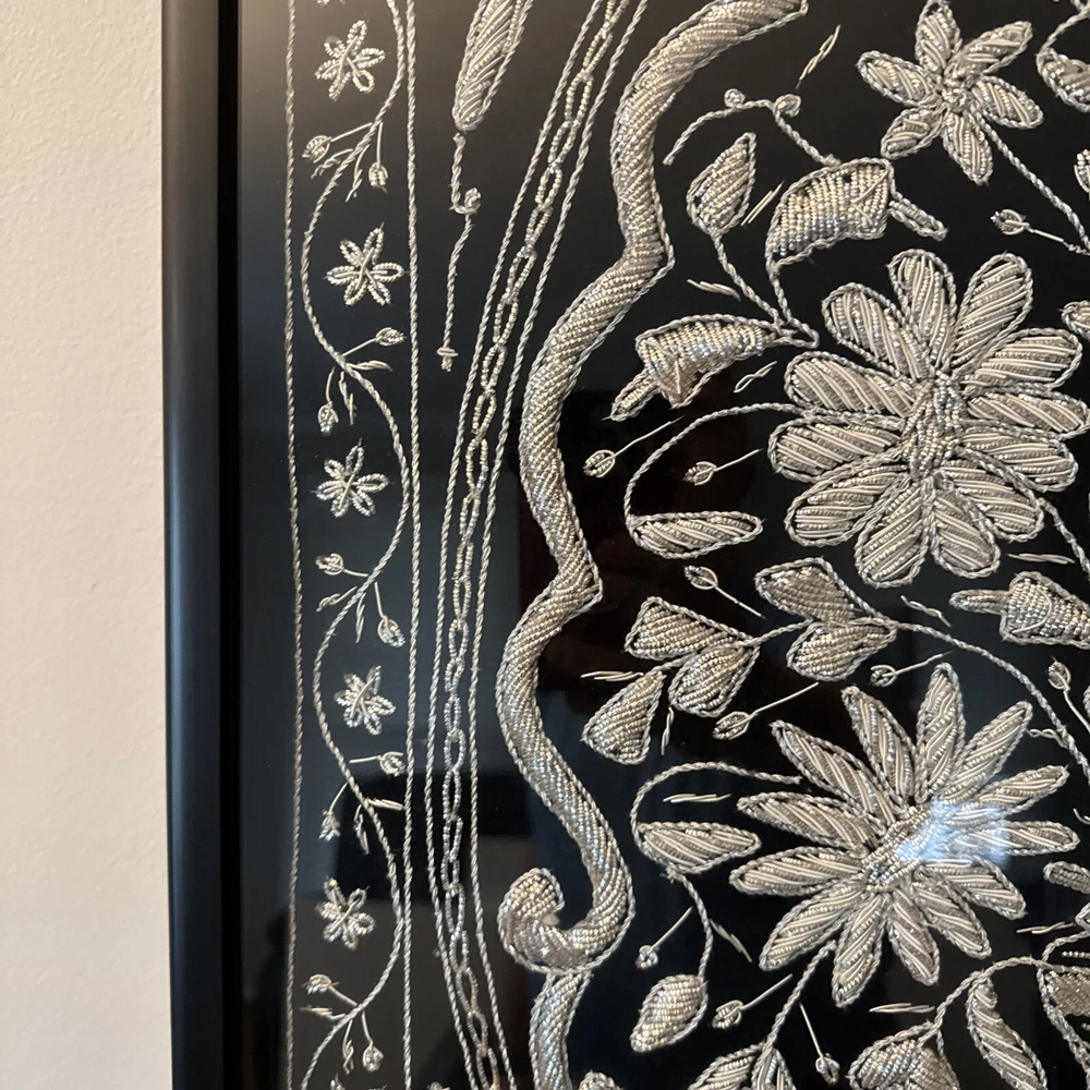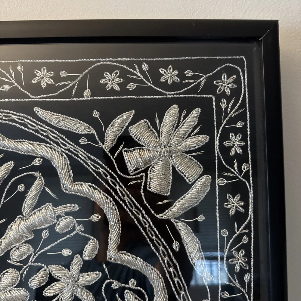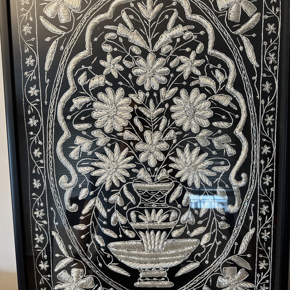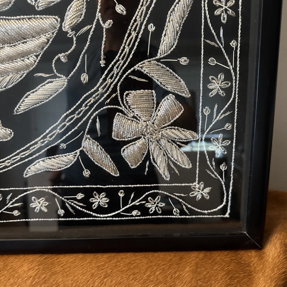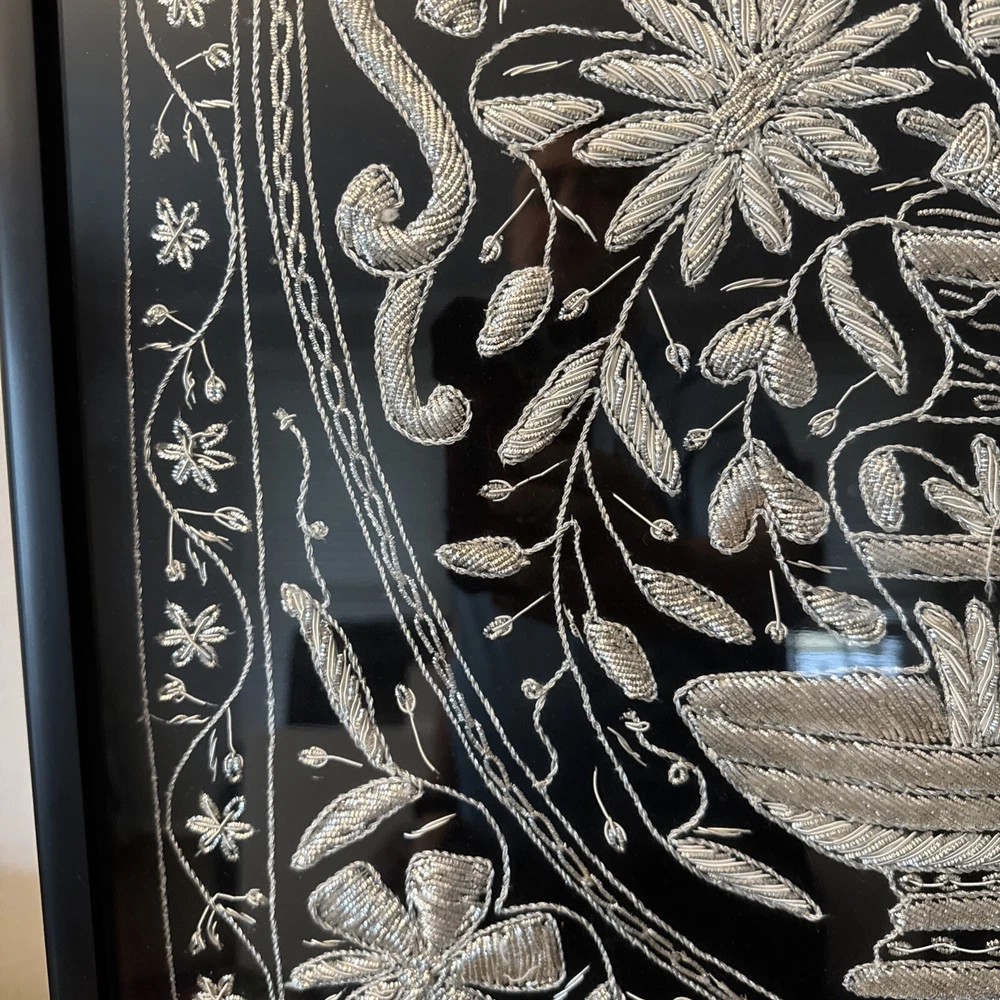 This exotic handmade tapestry originates from Oman and features a stunning design of a silver fountain with a flower vase, crafted with a blend of cashmere and silver thread in a Persian style. Sealed frame for protection and for preservation. Measuring 21 inches in width and 31 inches in height, this vintage piece showcases a beautiful floral pattern with a 3D effect, perfect for decorating various rooms in your home. Fairtrade certified and featuring intricate braided details, this decorative tapestry adds a touch of artistry and elegance to any space.