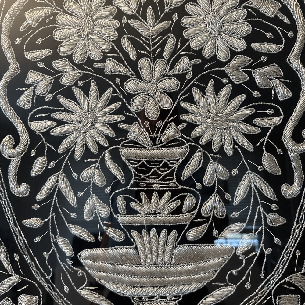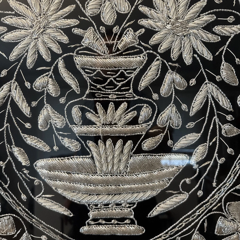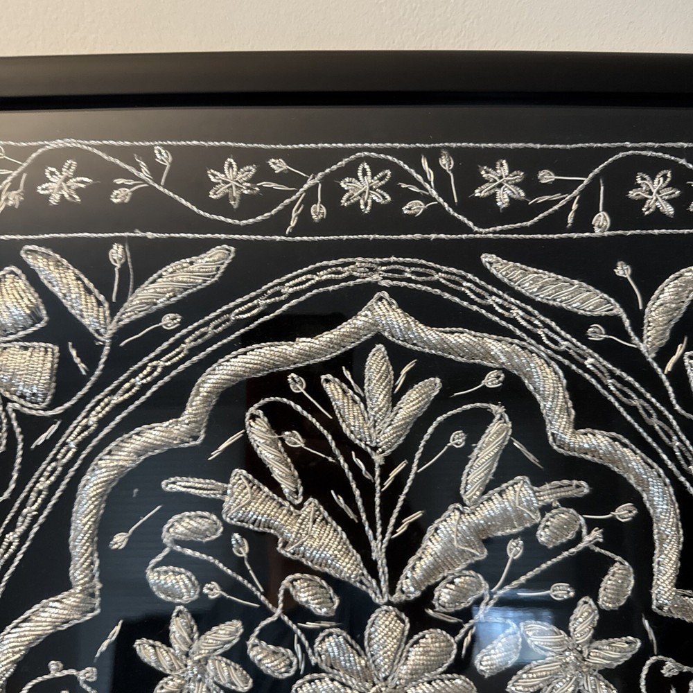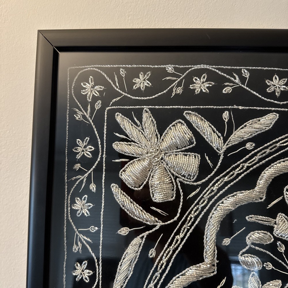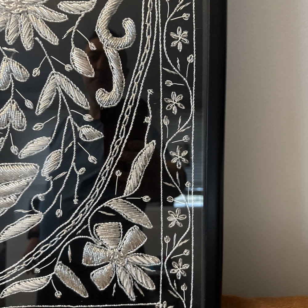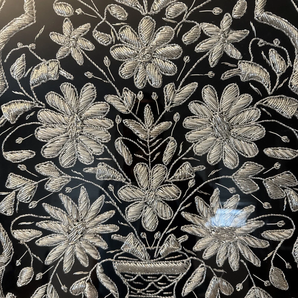 This exotic handmade tapestry originates from Oman and features a stunning design of a silver fountain with a flower vase, crafted with a blend of cashmere and silver thread in a Persian style. Sealed frame for protection and for preservation. Measuring 21 inches in width and 31 inches in height, this vintage piece showcases a beautiful floral pattern with a 3D effect, perfect for decorating various rooms in your home. Fairtrade certified and featuring intricate braided details, this decorative tapestry adds a touch of artistry and elegance to any space.