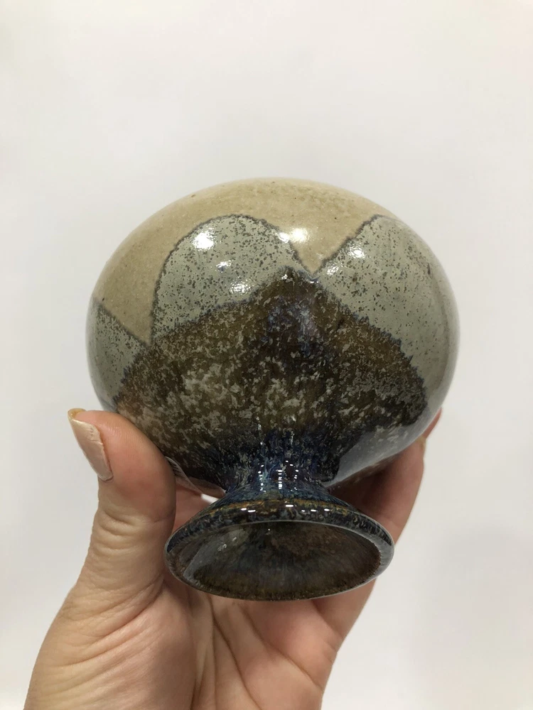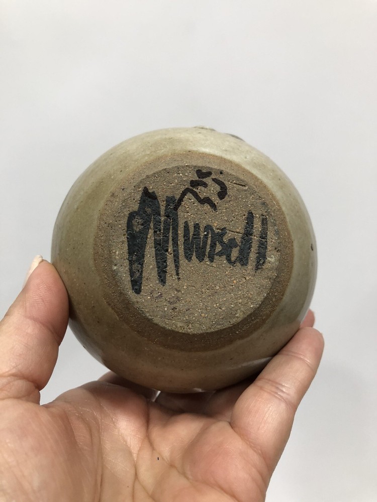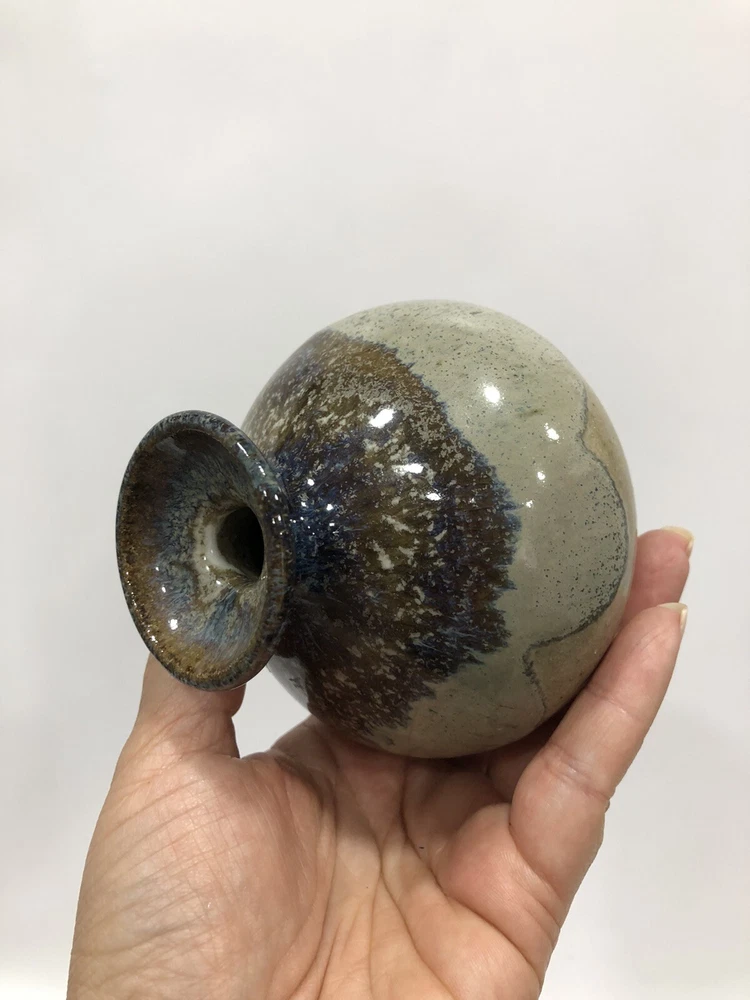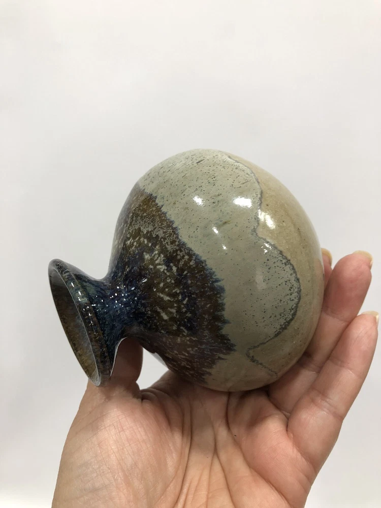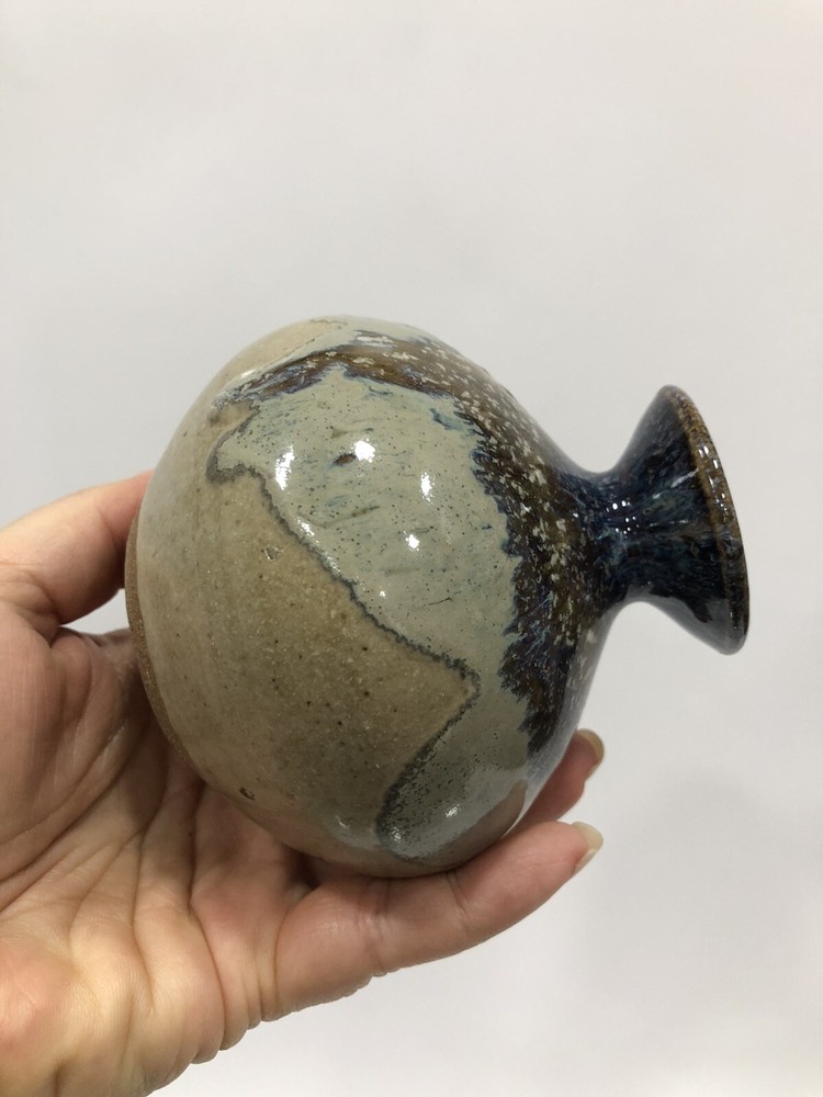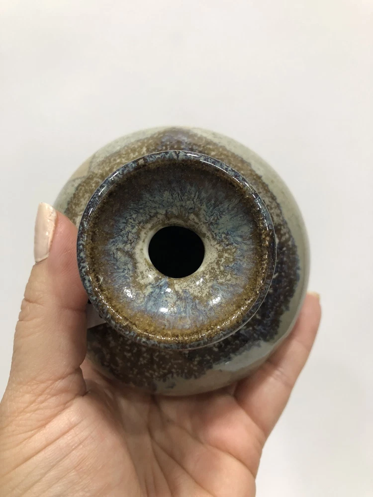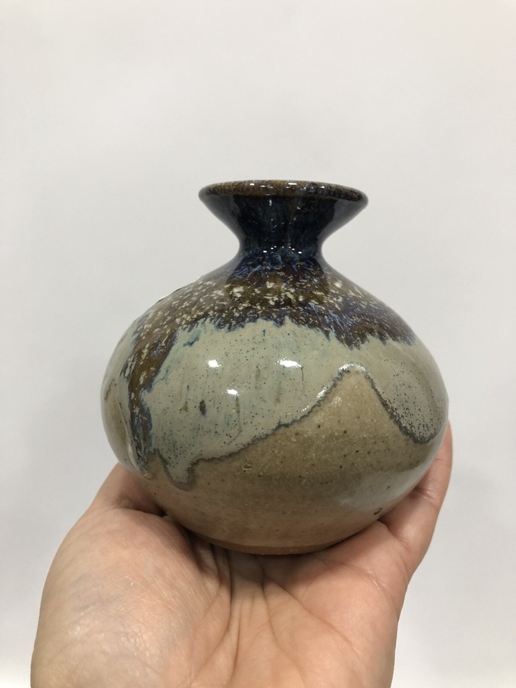 Beautiful Round Vase Stoneware Studio Art Speckled glaze, mottled on rim & inside Handmade Artist Signed on the bottom earth tones. Condition is "Used in great shape! 4.5”Tall; 1/2” diameter.Shipped asap by USPS Priority Mail.