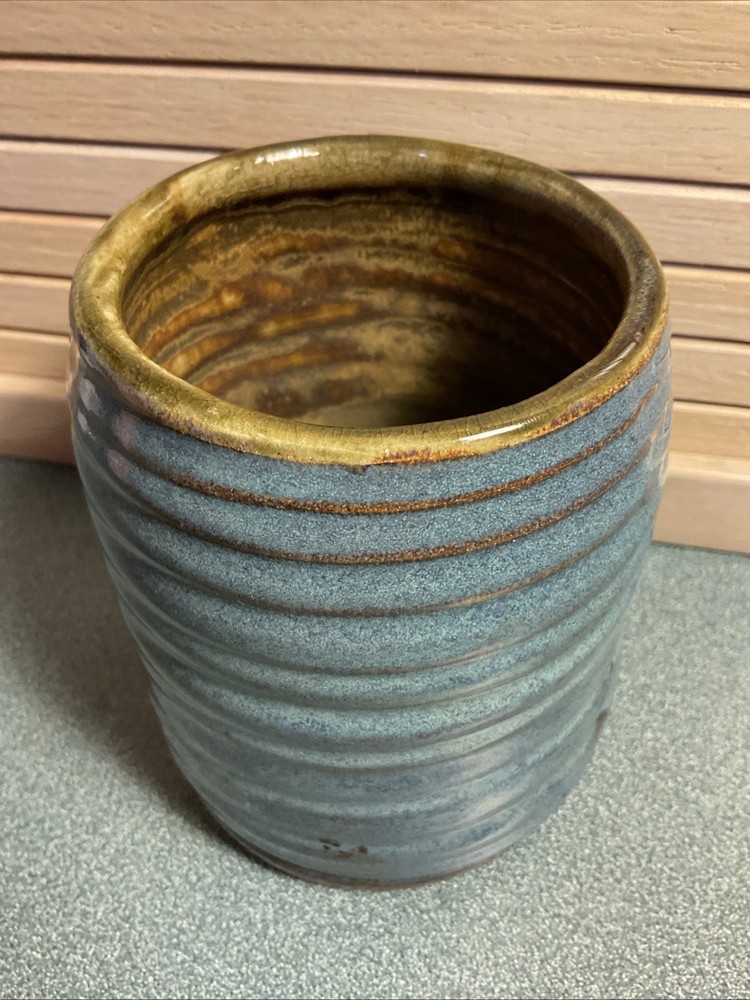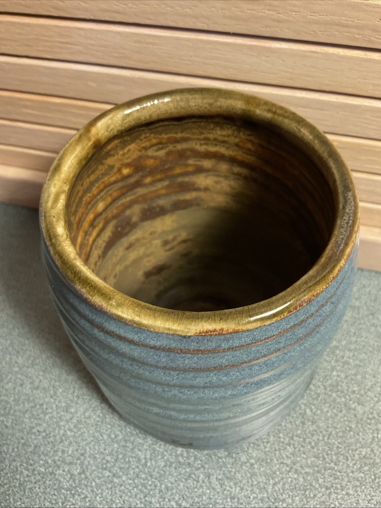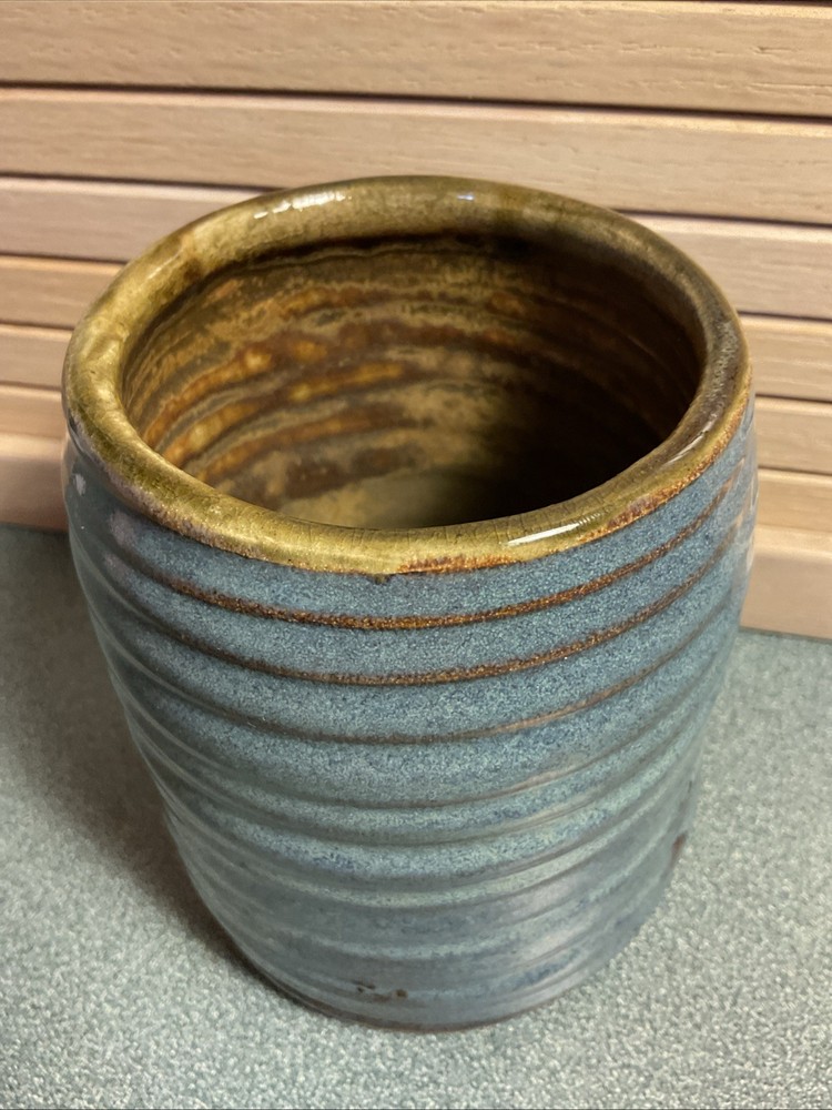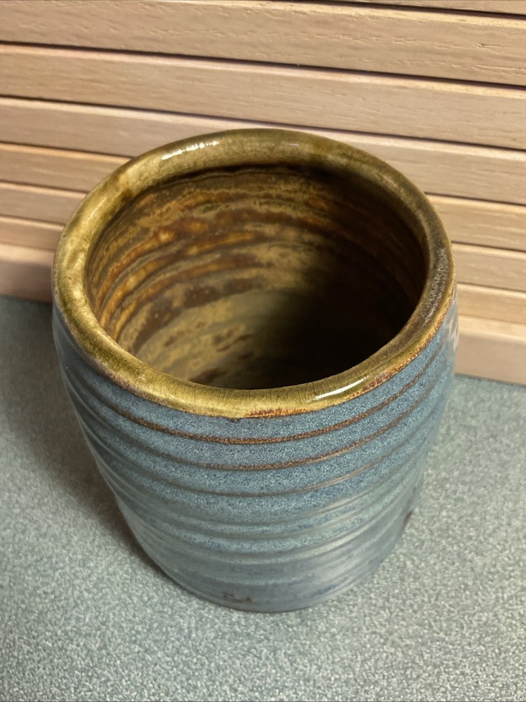 This handmade ceramic vase is a unique piece of art pottery featuring a beautiful blue color and a classic Arts & Crafts/Mission Style design. Crafted in the United States using traditional pottery techniques, this vase stands at 5 inches tall and weighs 2 pounds. The handmade nature of this piece adds to its charm and makes it a one-of-a-kind decorative item for any home. Perfect for any space that values artisanal beauty and craftsmanship.