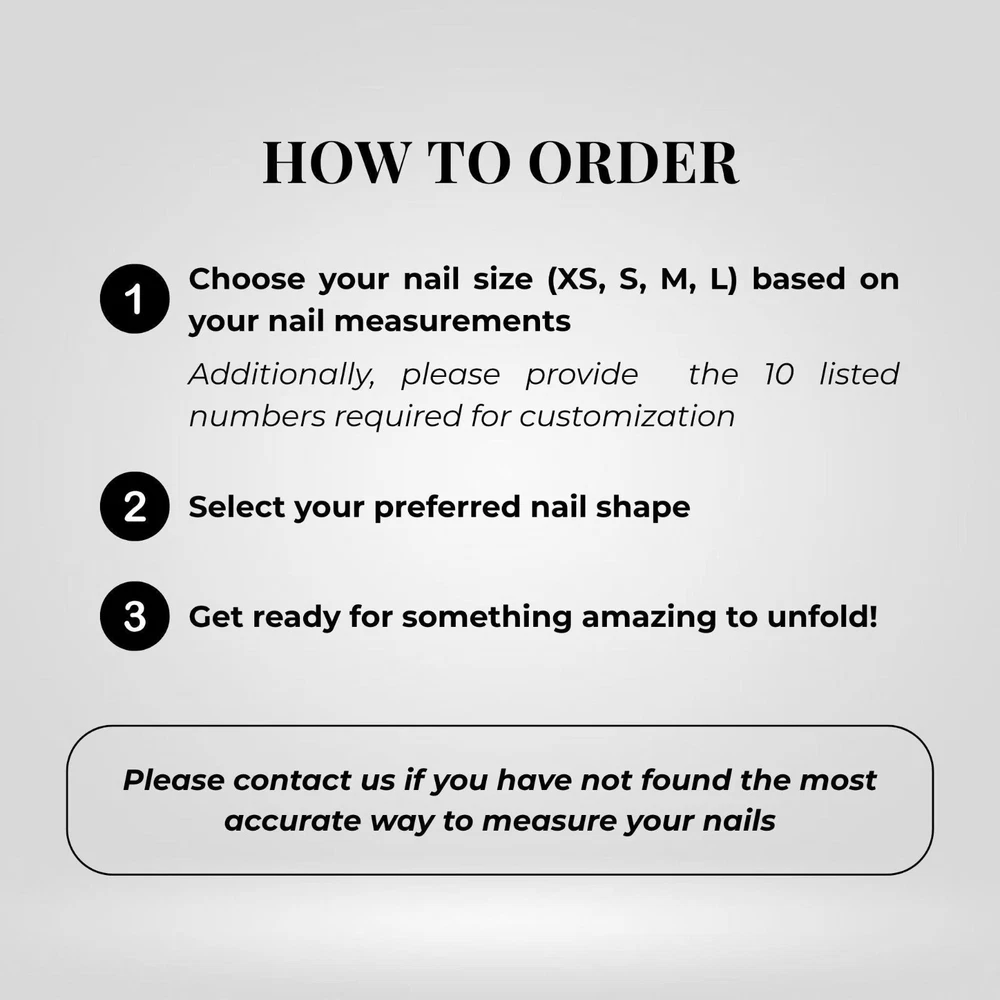 Hello, lovely! ๐ ๐ ๐ ๐ ๐ ๐ Greetings and welcome to my store. Hope you find a style you like. ๐ ๐๐๐ญ๐๐ซ๐ข๐๐ฅ: I only work with high quality materials to create sturdy & long-lasting luxury press on nails that you can trust on. My nails will last for: 1- 2 days using adhesive tab (provided with the nail set) 2- 3 weeks using nail glue. You can reuse all of the nails multiple times if you take care of them. Follow the instructions provided with the nail set. ๐ ๐๐๐๐ก ๐๐๐ข๐ฅ ๐ฌ๐๐ญ ๐ข๐ง๐๐ฅ๐ฎ๐๐๐ฌ: 10 nails of your size 24 adhesive sticks 1 nail file 1 nail glue 1 cuticle stick 1 alcohol wipe ๐๐๐๐จ๐ฎ๐ญ ๐๐ซ๐จ๐๐ฎ๐๐ญ: All of my nails are handmade and customized to fit your size. Please note that I can make any size and any shape you desire. Feel free to contact me if you would like some customization made.