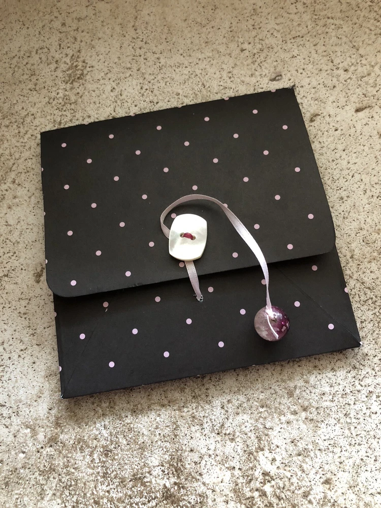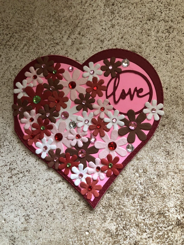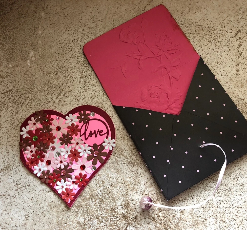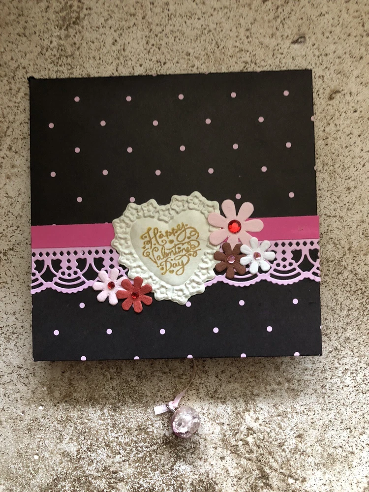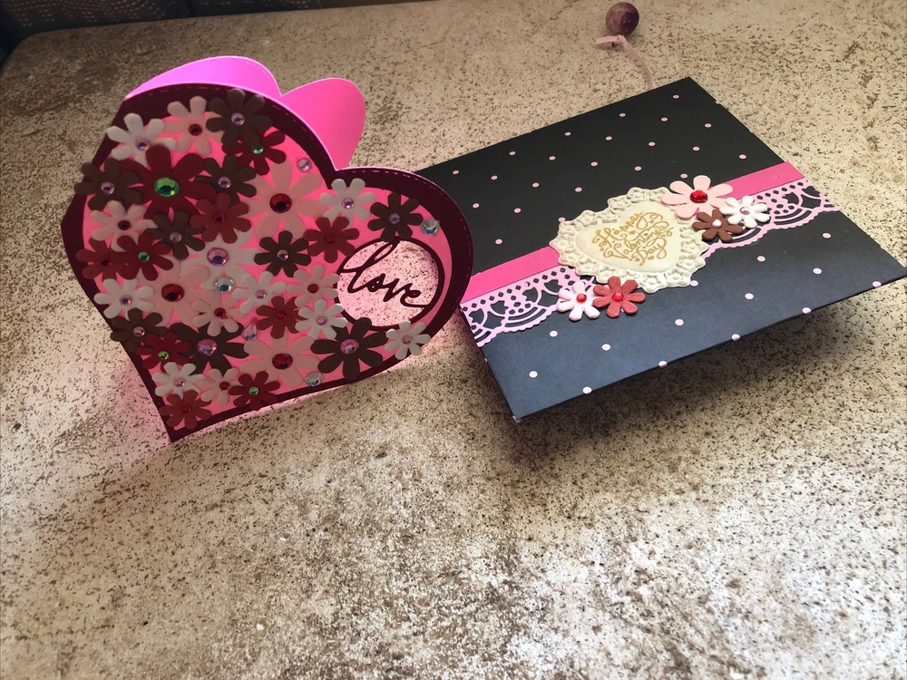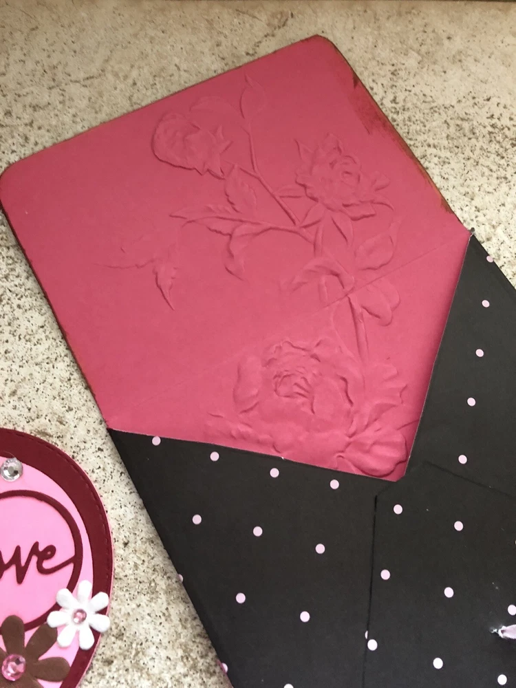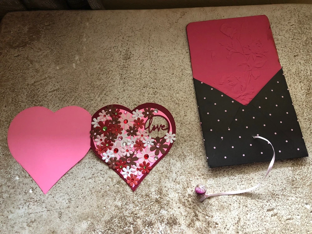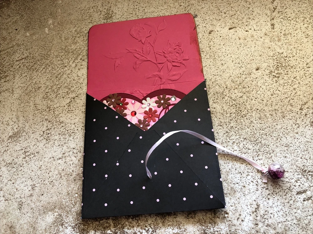 Handmade Valentine’s Card And Envelope About 5 inches tall and 5 inches wide This card and envelope has been lovingly hand crafted with scrapbook paper, rhinestones and ribbon. There is plenty of room for you to write your own sentiment. Please see my pictures and email me if you have any questions