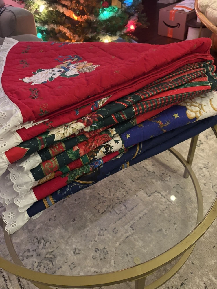 This product is a handmade vintage country Christmas tree skirt that measures 58 inches in size. It is designed in a classic red color and tailored for Christmas. Made with attention to detail, this one-of-a-kind tree skirt adds a festive touch to any holiday decor, bringing a traditional and rustic charm to your home during the festive season. Lined all around with lace detailing and solid red color on reverse side. Absolutely gorgeous!! Other prints and designs available, check out my other listings!