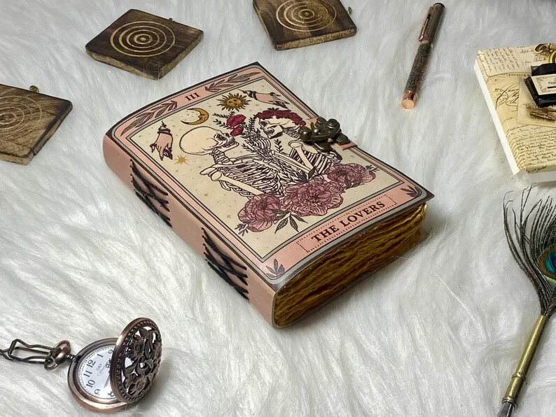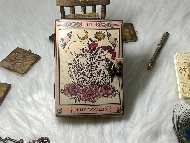 The Lovers Book of Shadows Handmade Leather Journal Grimoire Journal with Deckle Edge Paper Gifts for Men and Women Details :- Grimoire The Skull lover Leather Print journal Antique Notebook And Deckle Edge unlined paper. The lovers • Size - 7×5 inches,8 x 6 inches, 10x7 Inches 13X10 Inches • Color - • C-Lock • genuine leather • vintage deckle edge old paper • 100 Sheet (200 pages both side) ● Antique Paper - Vintage Journal is made of unique vintage paper which looks like it was pulled from history. You will love the old looking handmade cotton paper (200 pages) which is unique to our vintage journals. ● VINTAGE LOCK AND STURDY BINDING - The vintage lock will keep all your valuable writing locked inside.Sturdy hand stitched binding to make sure that no paper comes out loose from your vintage notebook. ● Sketchbook is great for keeping by the bedside to jot down dreams, or for use as a diary or journal. ● It is a truly unique and wonderful gift for a friend, the men, women, and wiccans in your life! or to treat yourself to as a special keepsake ● our journals are influenced by symbolism that is derived from the Wicca/Pagan community, creating a personalized space where your inner creative genius can flourish. ● The paper is made from sustainable cotton and jute canvas. The paper is acid-free and pH neutral therefore is a timeless piece of art. ● Use Any Kind Of Pen - Sketch, Doodle, Write on your journal notebook with a Calligraphy Pen Fountain Pen, Brush Pen, Ball Pen, Acrylic Colours, Watercolor and many more.