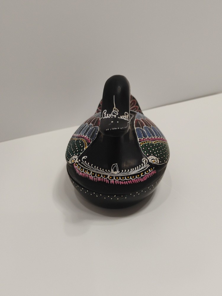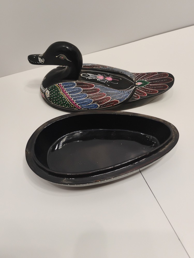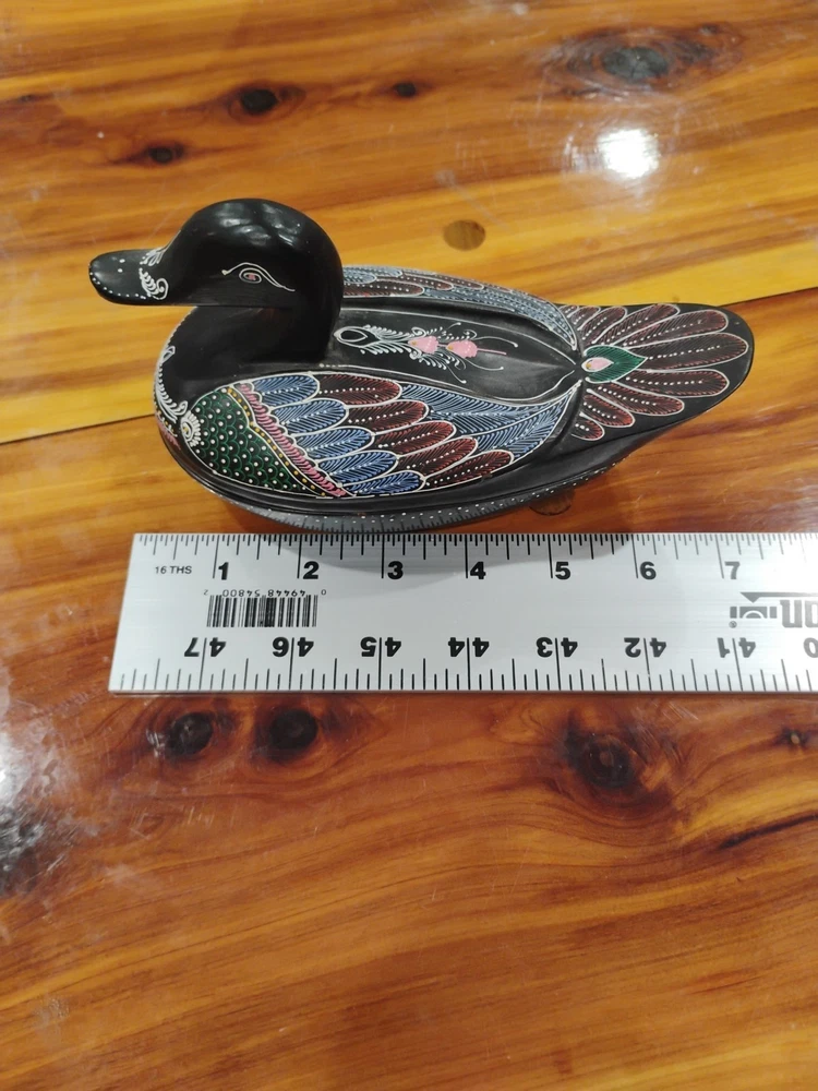 This product is a small handmade trinket box in the shape of a duck. It is made of wood with a matte finish and features a multicolor feather pattern. The box is 7 inches in length and opens to reveal a compartment for storing small items. It is suitable for all occasions and themes, including animals and wildlife. The duck is unboxed. It was made in Thailand.