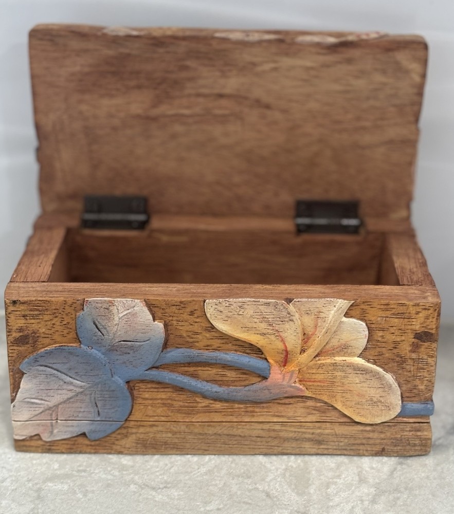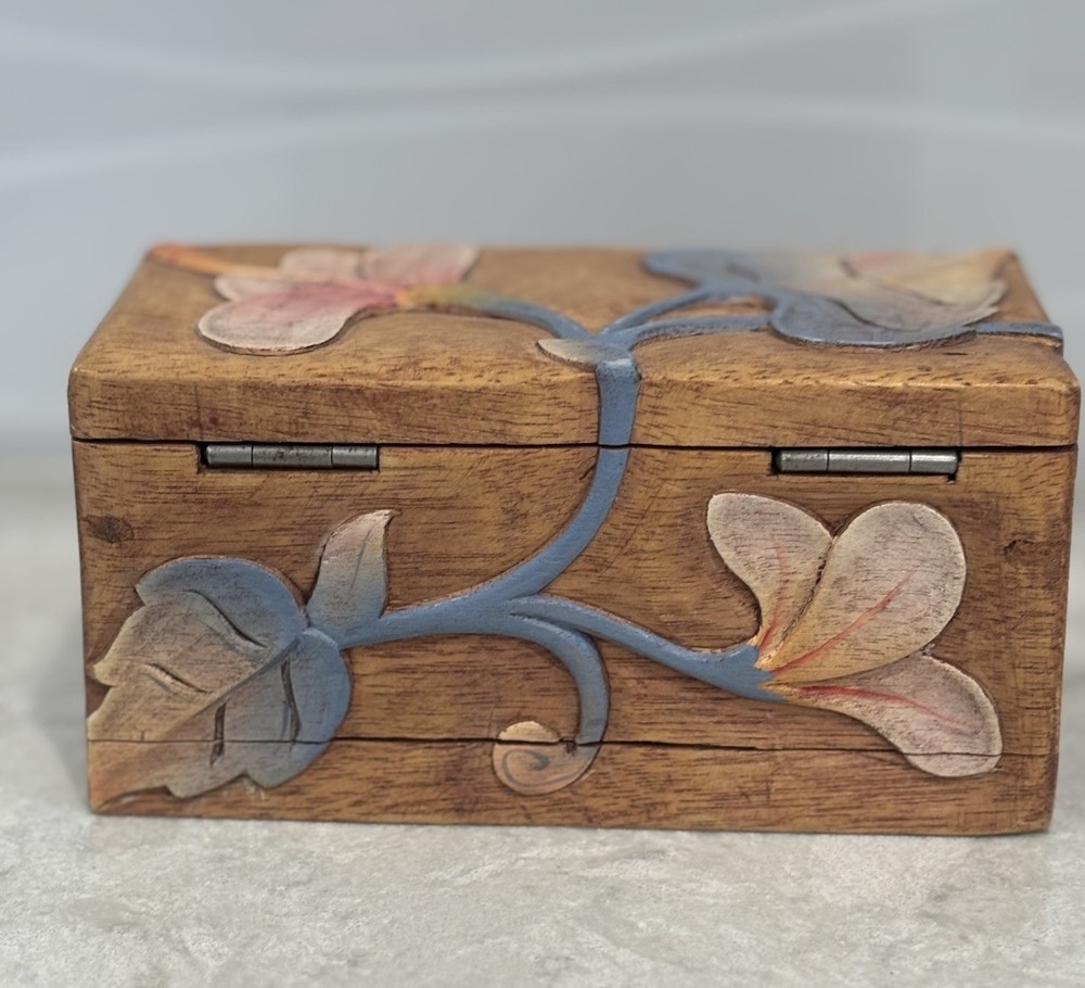 Handmade trinket box with hand carved painted leaves on five sides. It has a hinged lid. The box measures approximately 6” by 3” by 3”. It is preowned and in good condition.