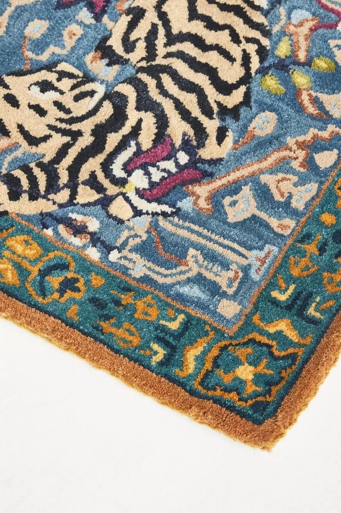 Handmade Wool Tufted Rug Agnes Design Blue Oriental Tiger Pattern Decor