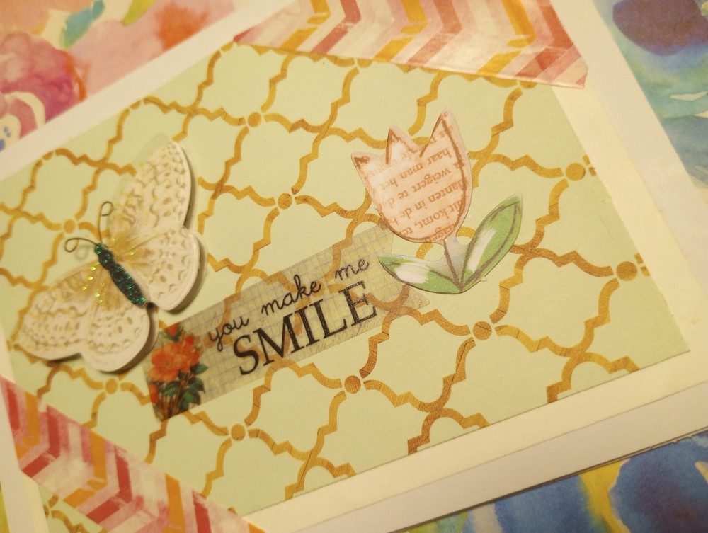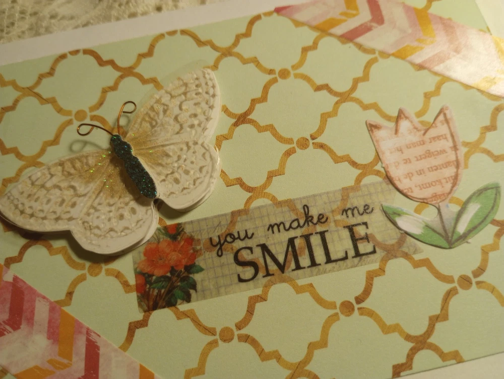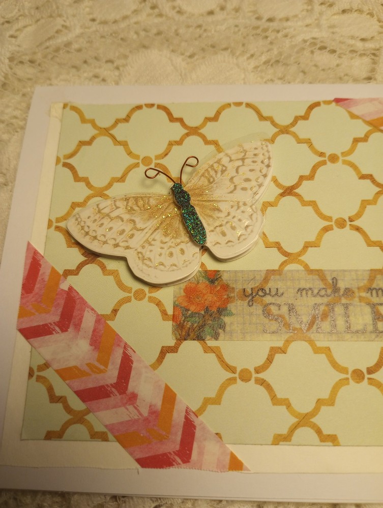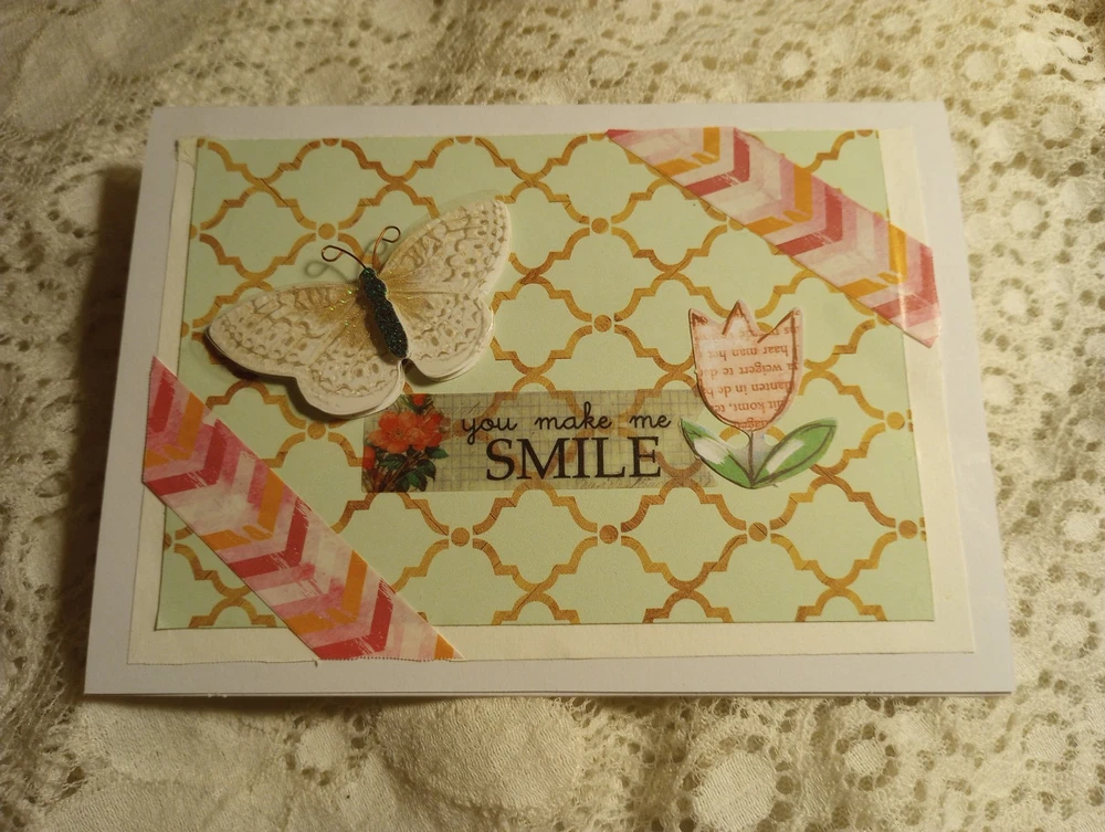 You make me smile, perfect card for cheering a friend up, or just to say hi. Used scrapbook paper, variety of stickers and deco tape. Measures 5.5 x 4 inches. Comes with envelope. Blank inside. Made by Cassie Lynn. Tags: You make me smile greeting card friendship greeting card any occasion greeting card spring break greeting card just saying hi encouraging scrapbooking paper stickers butterfly flowers glitter handmade homemade hand crafted artsy aesthetic scrappy style collage decor decorative mixed media washi tape mint green blue pink stationery note Card pen Pal Snail Mail gift For Her Birthday Graduation Anniversary Engagement Wedding Valentine's Day Present spring summer whimsigoth whimsygoth mixed Media Collage nature lover insect butterfly glam shabby Chic vintage aesthetic cottage core prairie girl garden God bless Jesus Christ prayer Bible study worship Church get well soon positive affirming encouragement encouraging You Make Me Smile - Any Occasion Greeting Card Just Saying Hi Hello Butterfly Whimsical Whimsy Mixed Media Collage Spring Summer Nature