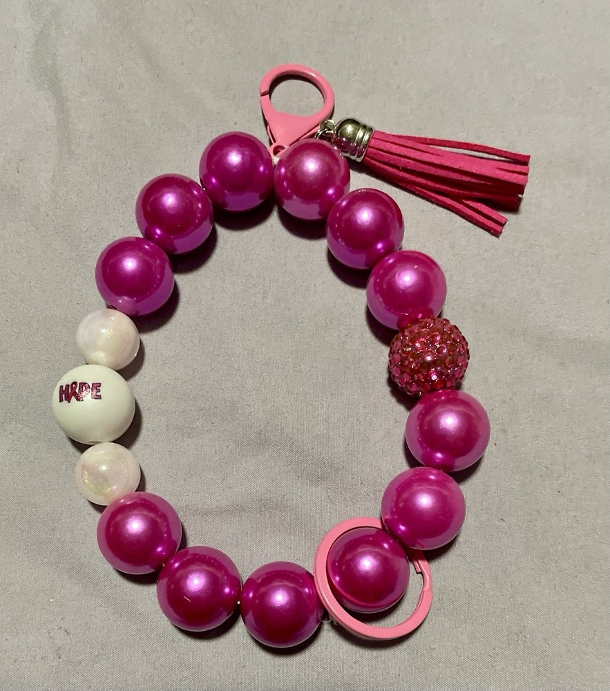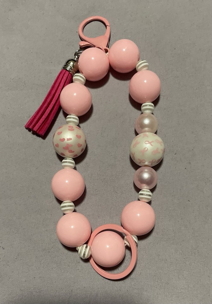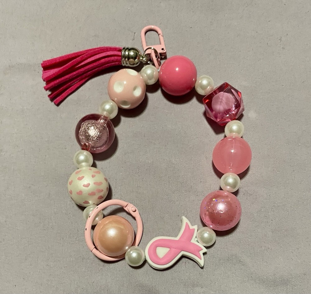 This handmade wristlet keychain features a pink ribbon, symbolizing breast cancer awareness. It is designed specifically for women, making it a thoughtful and stylish accessory to show support for breast cancer awareness. The keychain is a subtle yet meaningful way to promote awareness and support the cause.