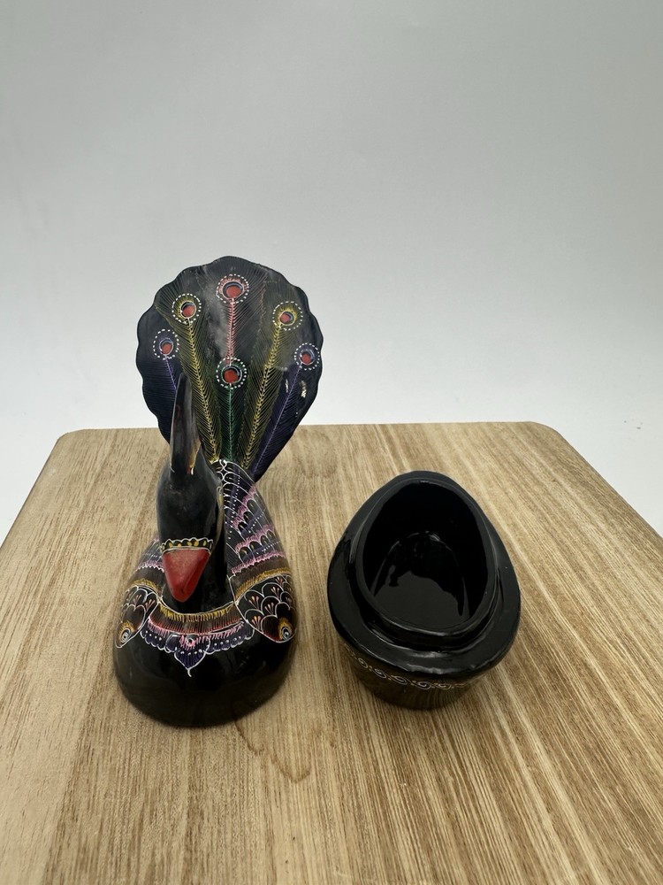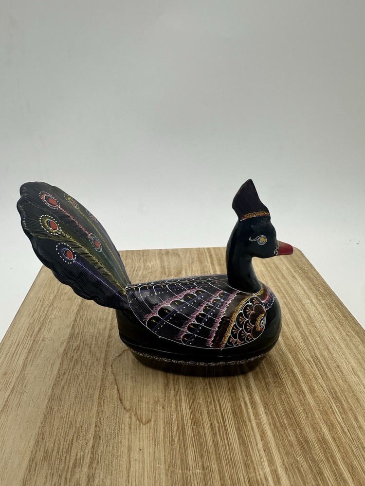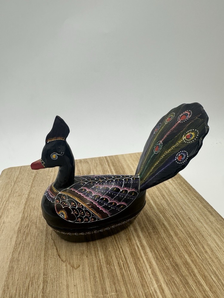 Handmade in Thailand Hand Painted Paper Mache Laquered Peacock Trinket Box w lid. 4.5” long with tail No chips, cracks or damage