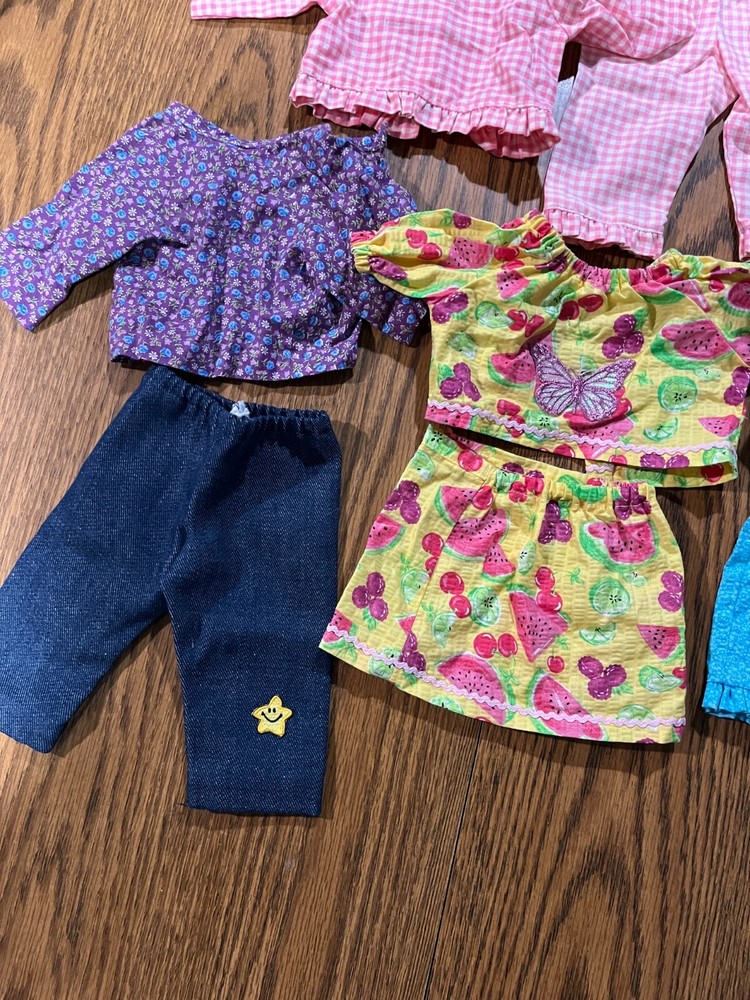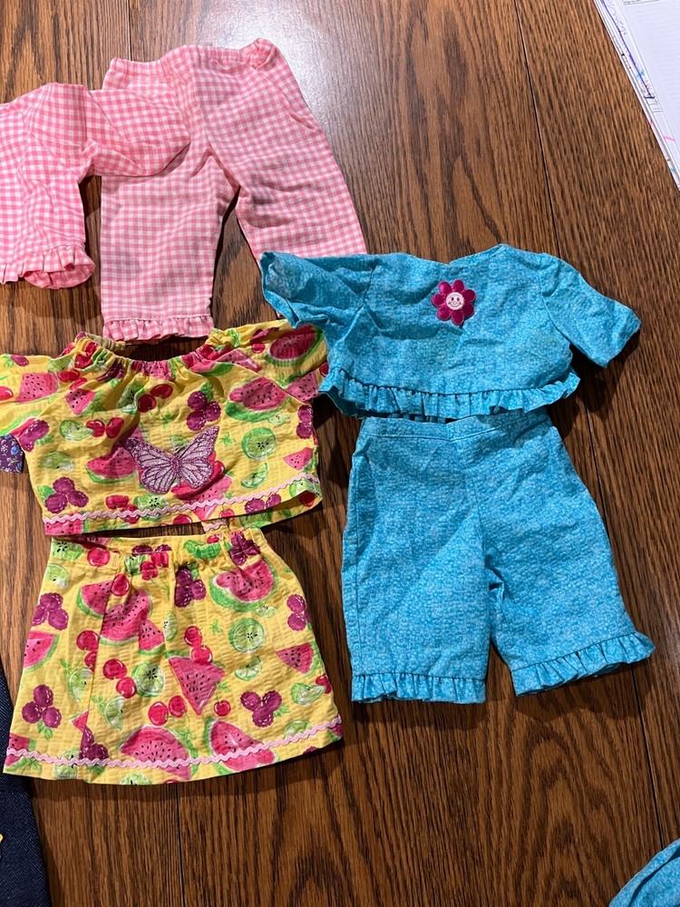 Handmade outfits for American Girl Dolls (4 Outfits) Please note these will need new iron on Velcro on the back for the shirts to close