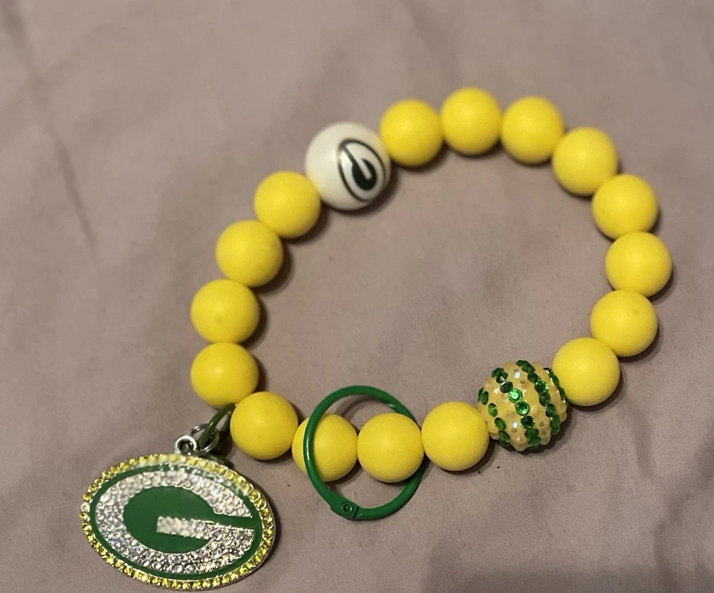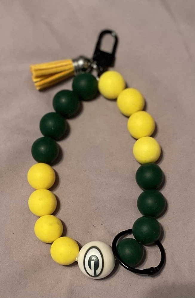 This handmade silicone wristlet keychain features the logos of NFL teams and Nebraska, perfect for women who are fans of both football and the University of Nebraska. The colorful design adds a fun pop to any keychain collection, and the durable silicone material ensures long-lasting use. Ideal for showing off team pride while keeping keys organized, this unique accessory is a must-have for any fan of the sport.