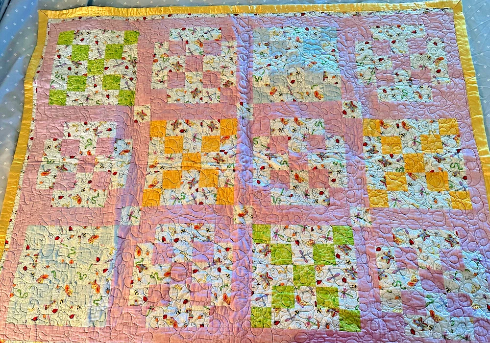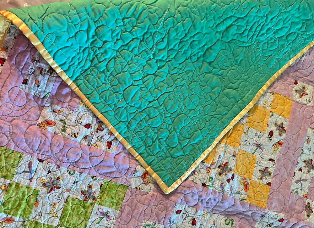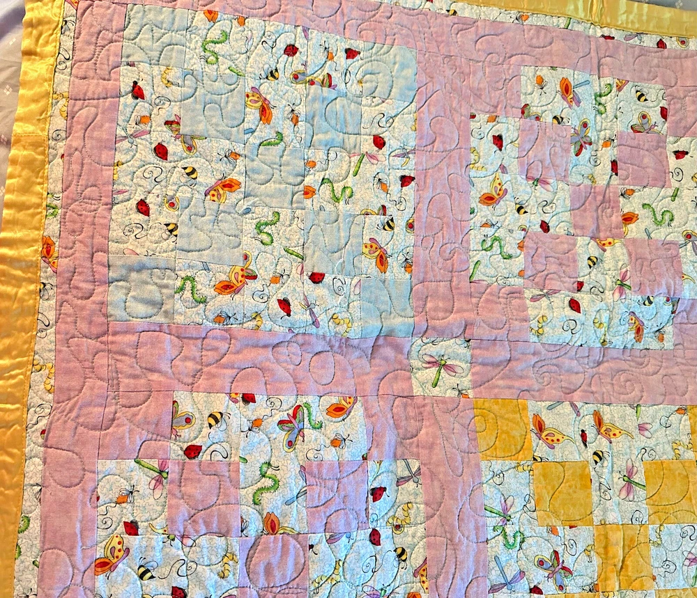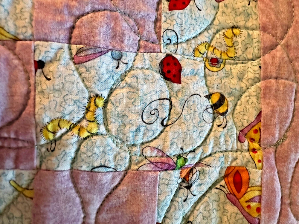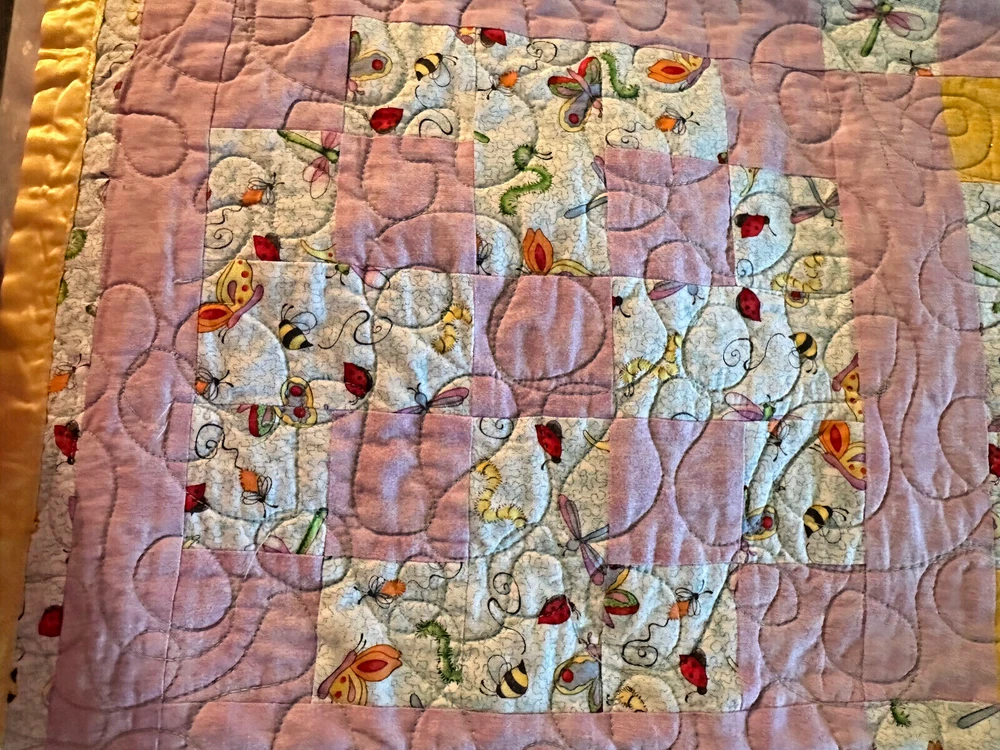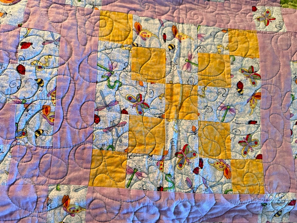 Lovely quilt is very soft and light with light batting. The sashing is lavender. Lighter fabric for the squares is butterflies, ladybugs and more; mixed in with a variety of other color squares.Bright and colorful. Very well done. Machine stitched. The trim is a bright yellow satin or silk; shiny. Backing is bright green. Fully quilted; see pic from the back. Please see our other items and combine shipping. Many thanks! jo 7