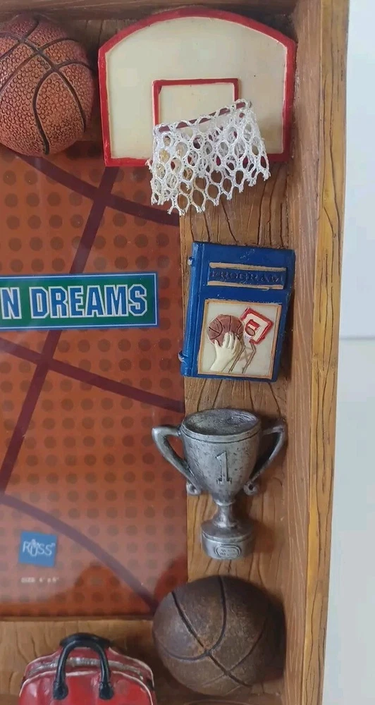 Shape: Rectangle Model: Hoops 'n Dreams Item Width: 7 in Color: Multicolor Item Height: 8 inches Material: Wood Box Frame Depth: 1 in Type: Photo Frame Theme: Sports Finish: Matte Suitable for Photo Size: 4 x 6 in Brand: Russ Item Length: 6 1/8 inches Photo Insertion Type: Rear-Loading Photo Capacity: 1