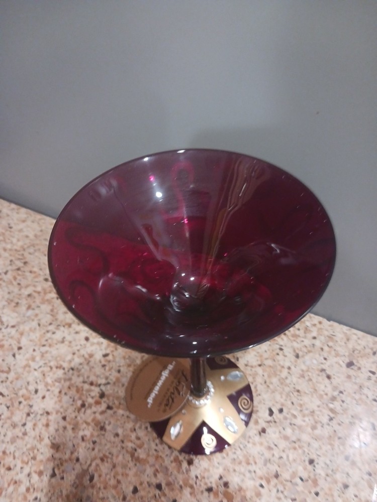 The Lolita hand painted Martini glass is a whimsical and festive addition to your holiday celebrations. This unique glassware piece features a vibrant red color and intricate hand-painted details, perfect for serving your favorite cocktails during the festive season. The bejeweled design adds an extra touch of sparkle, making it a standout piece for Christmas gatherings.