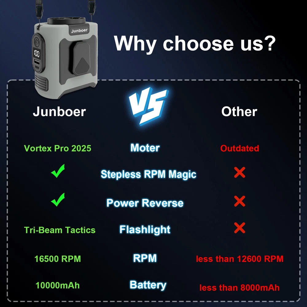 Stay Cool Anywhere with Our 2025 Upgraded Portable Waist & Neck Fan! Introducing the next-generation Wireless Portable Waist & Neck Fan – now with smarter controls and enhanced performance ! Designed for outdoor adventures, workdays, and everything in between, this versatile fan keeps you cool with precision airflow control and added safety features . " I work in construction and working outside or inside newly built structures without AC is very hard to function. These fans are perfect when there is no breeze or ventilation. A must for blue collar workers. Recommended by a Blue Collar worker. " ( Verified review from a construction worker battling summer heat daily.) Key Upgrades: Hyper Performance Motor • Upgraded 16500 RPM motor delivers 30% increased max airflow (vs previous gen) Smart Speed Control • Tap to switch between 4 preset speeds • Long-press for seamless variable speed (gradually adjust from gentle breeze to turbo boost) 3-in-1 Multi-Function Safety Light • Large built-in LED panel with adjustable brightness (high/low) + SOS strobe mode , perfect for emergencies during outdoor activities Adjustable Airflow • Manually adjustable airflow angles (direct airflow to your desired direction) Upgraded drop resistance • The silicone shell absorbs impact while remaining flexible Premium Features (Retained & Improved): ✔ 10,000mAh Power Bank – Charges your devices while cooling you ✔ Type-C Fast Charging – Up to 75% charge in about 1 hour (full charge in 5 hours) ✔ 24H Runtime – Now more efficient with the upgraded motor ✔ 285g Ultra-Light – Durable ABS construction in 3 colors Why This is The Ultimate Cooling Tool? Outdoors – Hiking/Camping with strobe light safety Work – Adjustable airflow for office or outdoor jobs Fitness – Variable speed matches your workout intensity Commute – Compact yet powerful enough for crowded spaces Package Includes: 1× Upgraded Waist Fan (with FREE lanyard/ neck strap ) 1× USB-C Charging Cable 1× User Manual Order Now & Experience: ✔ Upgrades cooling with intelligent speed control ✔ All-scenario readiness (light + airflow customization) ✔ Future-proof motor technology (16500 RPM) From construction sites to mountain trails—stay cool wherever work or adventure takes you. Whether you’re grinding at the gym, cycling, fishing, powering through a hike, or tackling a sun-baked job site, this fan delivers relentless airflow to beat the heat. Built for campers, climbers, and blue-collar warriors. Heatwaves don’t stand a chance. On Aug 20, 2025 at 21:12:24 PDT, seller added the following information: