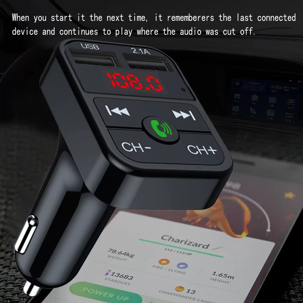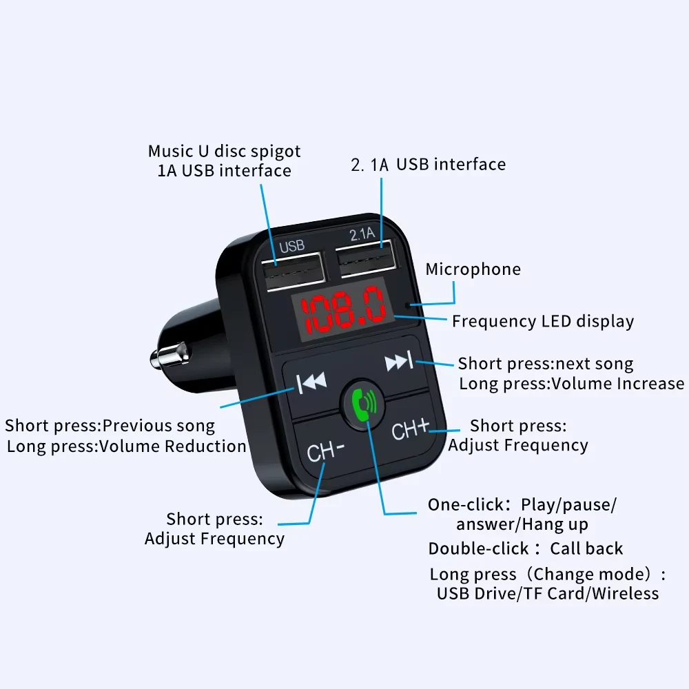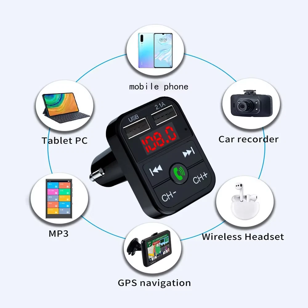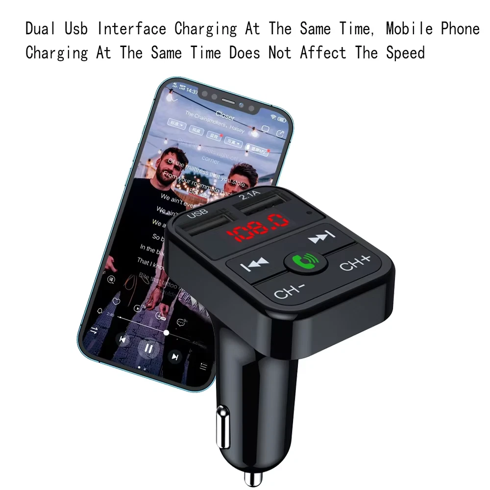 Features: Rated operating voltage: DC12V-24V Working Voltage limits: 9-26V USB1 Output: 5V/2.1A USB2 Output: 5V/1.0A , read USB Flash music. Support Play format: MP3 Bluetooth Version: Version 5.0+EDR Bluetooth transmission distance: 10M Bluetooth microphone effective range: 0.5-2M FM transmission frequency: 87.5-108Mhz Package included: 1 x Bluetooth Car MP3 Player