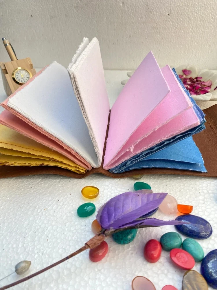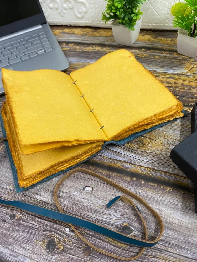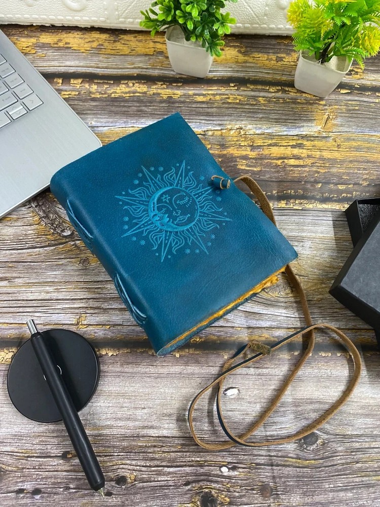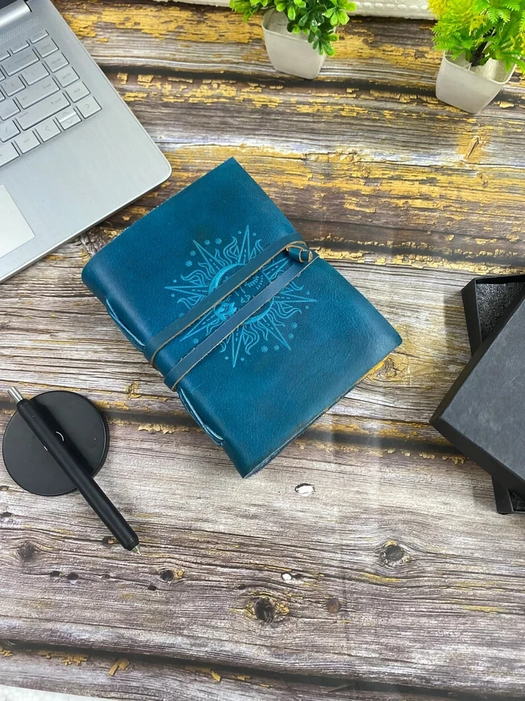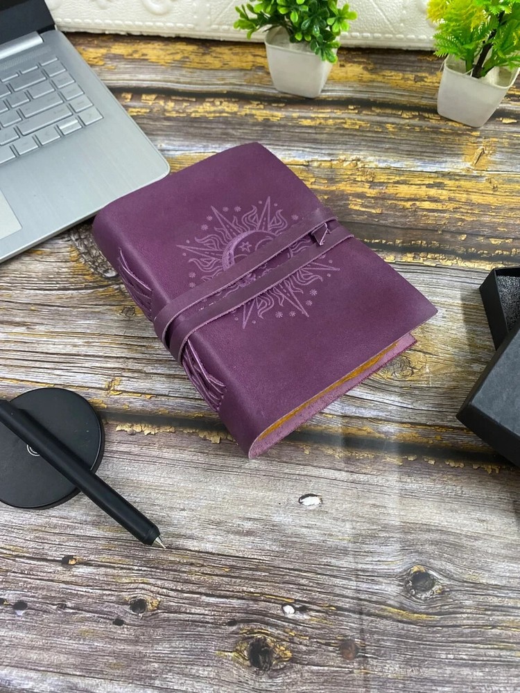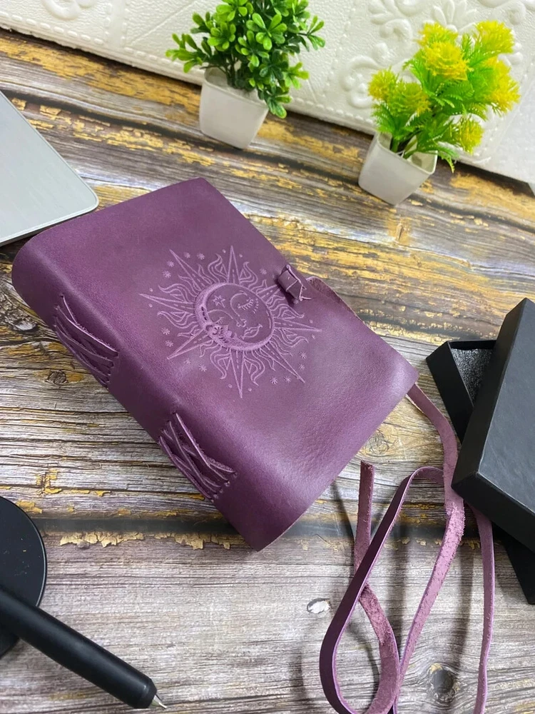 This product is a luxurious and limited edition leather spellbook handstitched with a purple and ocean blue cover. It features a brass C clasp lock for secure closure. Handmade in India, this A4 and A5 size book can be personalized to make it a unique and special item for any business or industrial use. With its high-quality materials and craftsmanship, this spellbook is a rare find for those seeking a premium and personalized writing instrument. Elevate your journaling experience with the exquisite "Sun and Moon Embossed Purple and Ocean Blue Leather Journal" from TajHandicraftGifts. This artisanal masterpiece effortlessly marries celestial charm with unparalleled craftsmanship, inviting you to embark on a journey of self-expression and creativity. Meticulously handcrafted, this journal stands as a testament to the dedication and artistry that TajHandicraftGifts pours into every creation. Measuring a convenient 7x5 inches, this journal's dimensions are perfectly tailored to accompany you on adventures, both inner and outer. The leather cover, adorned with intricate sun and moon embossing, radiates a timeless energy—symbolic of harmony and balance between opposing forces. The sun represents vitality and illumination, while the moon embodies introspection and mystery. Together, they set the tone for your journaling exploration. Distinguished by its unique versatility, this unique journal features not only one but four choices of color pages: serene blue, classic white, vintage elegance, and delicate pink. Each page offers a distinct backdrop to your thoughts, sketches, and musings. With every turn, you'll find a canvas that resonates with your mood and inspiration. Adding to its allure, a brass C clasp lock adorns the journal's cover. This lock not only secures your innermost thoughts but also symbolizes the treasured writers journal secrets and intentions that lie within. Like a guardian of your aspirations, it embodies the essence of timeless mysteries. For gifting, the Sun and Moon Embossed Leather Journal is a thoughtful choice that transcends occasions. Whether for your loved ones or friends, this journal embodies the spirit of connection and creativity. Handmade by TajHandicraftGifts, blank journal it exudes authenticity and passion, making it a keepsake to be cherished for years to come. Indulge in the duality of the cosmos and the magic it inspires. With the Sun and Moon Embossed Leather Journal, you're not just holding a journal—you're holding a universe of possibilities, waiting to be explored, expressed, and celebrated.