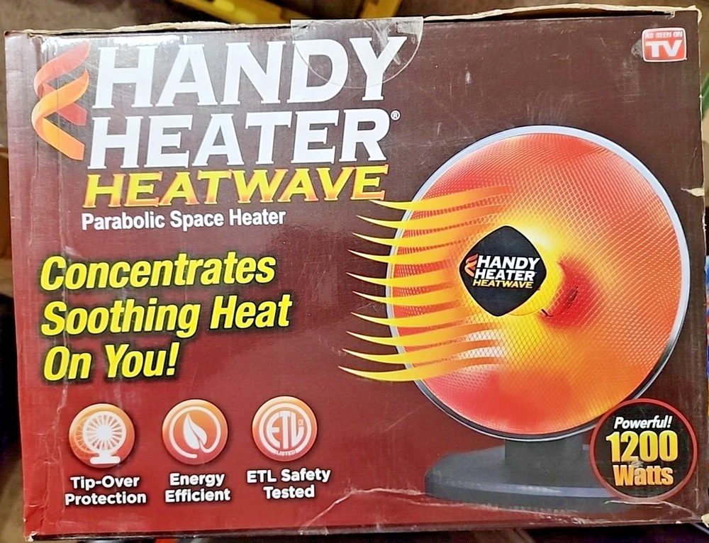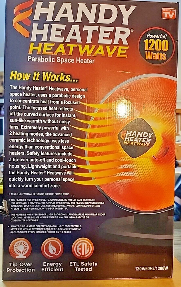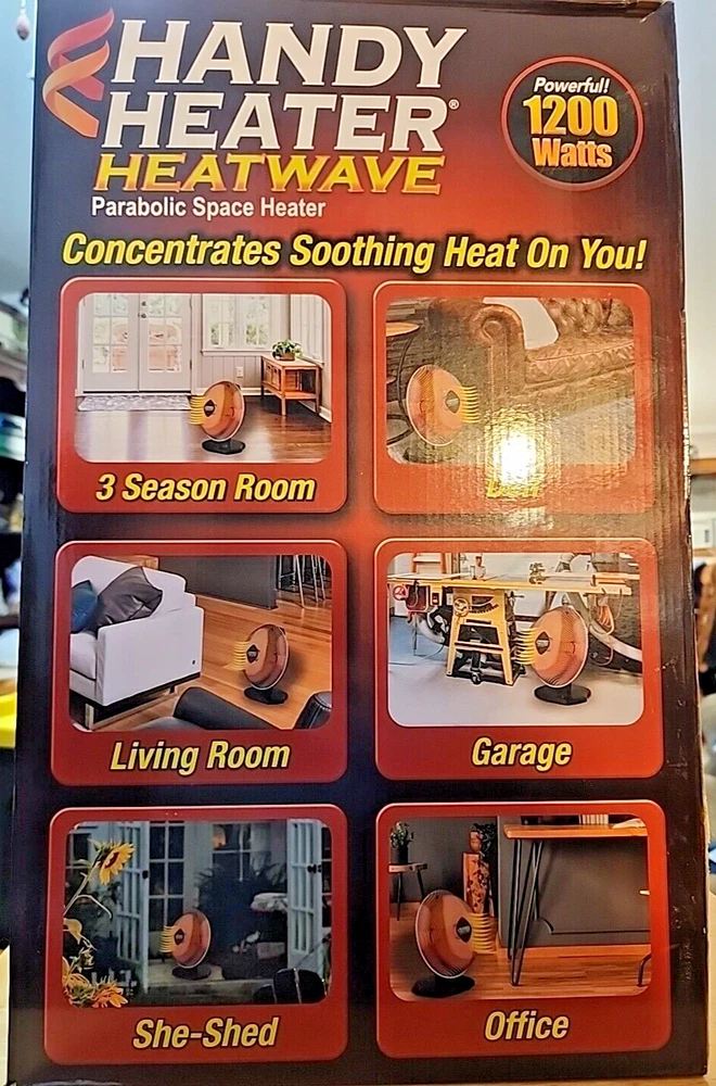Handy Heater Heatwave Parabolic Space Heater w/ Ceramic Heating Technology 1200W About this item Compact Space Heater: This safe and efficient electric heater provides 350 watts of smart heating power to heat up to 250 square feet using Ceramic Heating Technology for maximum energy efficiency Advanced Safety Features: This heater features a 15" Radiant Dish for energy efficient heating with Auto-Off Tip Over Protection and a Cool Touch Housing for the ultimate in personal safety Versatile Function: This heater plugs into any outlet for instant warmth anywhere; Its digital temperature display and On/Off timer allow you to customize settings for your own personal comfort Compact Design: Have warmth and comfort wherever you like to relax; With the Handy Heater’s compact and portable design it's perfect for travel; Take it with you wherever you like to keep warm Energy Smart Heating Power: The Handy Heater features 350 watt energy-smart fan forced heating power, to warm up your space no matter how big or small: office, bedroom, garage, bathroom and more Customer Reviews 4.2 4.2 out of 5 stars 362 ratings 4.2 out of 5 stars ASIN B08PY1NRVN Best Sellers Rank #435,728 in Home & Kitchen ( See Top 100 in Home & Kitchen ) #819 in Indoor Electric Space Heaters Model Number HEATP-MC1 UPC 735541181207 Brand Name Ontel Features & Specs Heating Coverage 250 square_feet Heating Element Radiant Heat Output 350 Watts Fuel Type Electric Number of Speeds 2 Voltage 120 Volts Heating Method Radiant Recommended Uses For Product Office, Garage, Desk, Home Mounting Type Floor Mount Room Type Bedroom, Home Office, Study Room Additional Features Cool Touch Exterior Indoor Outdoor Usage Indoor Power Source ac Will ship in original box Please look at the photo's. If there are more than one of the same item it will be a stock photo. Feedback is automatically given after you leave feedback for me. Shipping discount will be give in the form of a refund when buying more than 1 item after package is ready for shipping Thanks for looking.