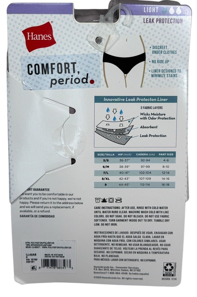 HANES Women’s Period Comfort 3-Pack Bikini Underwear Black Grey Light Size 9/XXL New 3-Pack Women’s Size Available: 2X-LARGE / 9 Color: Black Tan Grey Leak Protection: Light Description: 87% Polyester 13% Spandex Mesh Gusset: 100% Polyester Retail Price: $30+ Tax Machine Washable Imported