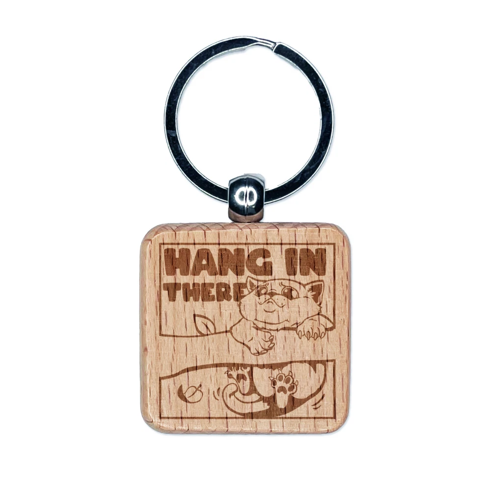 Hang in There Cat Engraved Wood Square Keychain Tag Charm