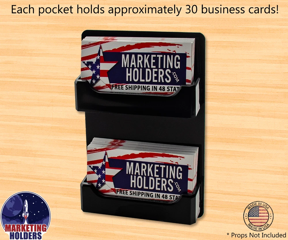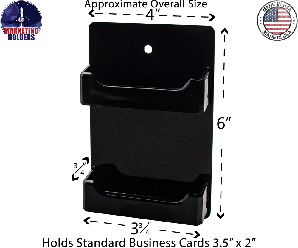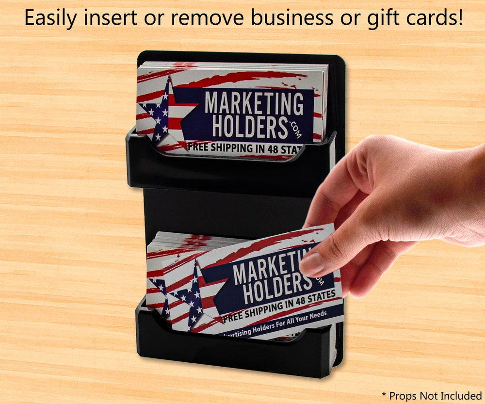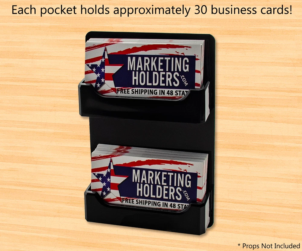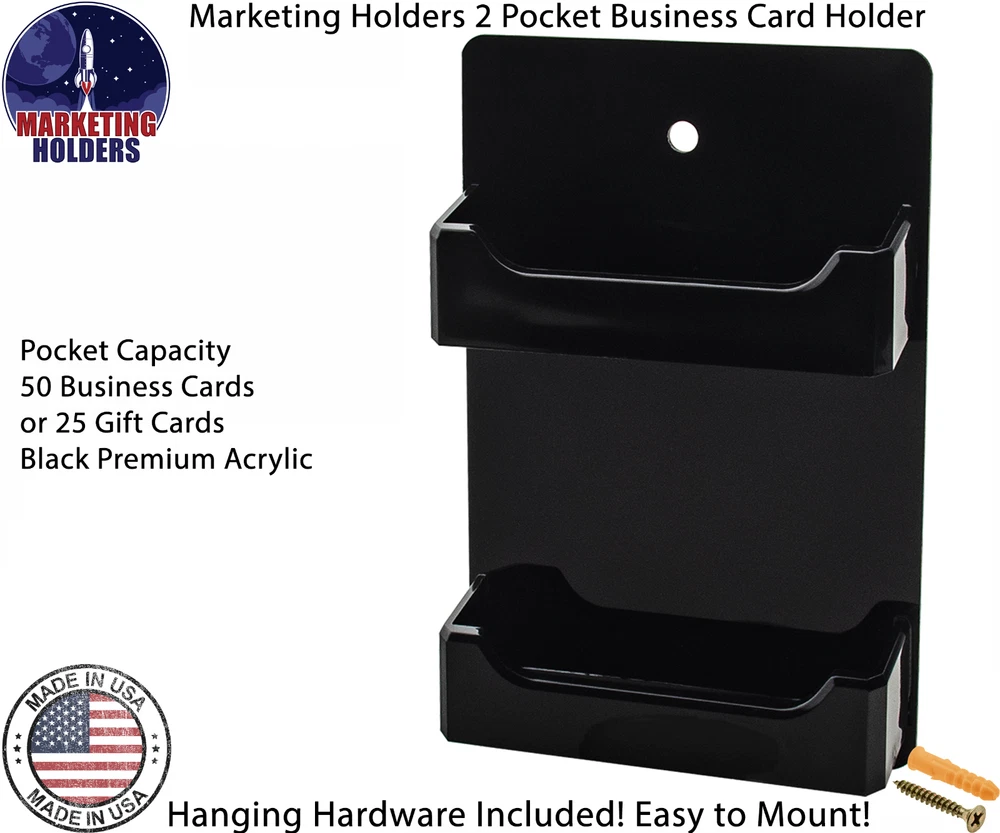 2 Pocket Gift Card Retail Holder Card Display Contact Wall Mount Product Features: Holds 3.5”W x 2”H standard sized business cards, appointment, membership, gift or rewards cards Pocket Dimensions: 3.5”W x 2"H x .75”D Overall Dimensions: 4.25"W x 4.75"H x 1"D Pocket Capacity: 50 standard business cards or 30 gift cards Perfect space saving multi pocket wall mount display holder with pre drilled holes and hanging hardware This double pocket space saving wall mount business card holder provides a sturdy display for business, gift or appointment cards that complements any decor. These multi slot card racks are great space savers and help you keep counters free and clear of clutter. Looking for a convenient way to distribute multiple sets of cards in one convenient card organizer rack? Business card holders make spreading the word on the multiple sets of cards simple and easy to access and still appear professional. Just one holder to display multiple sets of printed material and help keep the clutter to a minimum. The appointment card display rack has a design that makes it easy for clients and potential customers to take one. Each pocket can hold up to 50 standard business cards so you will not have to fill them that often. This gift card showcase display is made with acrylic plastic material and made right here in the USA. The wall card rack provides long-term durability in addition to keeping your 3.5 inch by 2 inch printed material neatly in the holder, and can be easily placed on any wall by exits or entrances. We have designed these to display several sets of business cards and can be conveniently placed on walls or anywhere you want to leave your calling cards for the taking. These card holders come pre-drilled for easy hanging and includes hardware. All sizes are approximate Under no circumstances is Marketing Holders responsible for any actions involving hanging products using self purchased or provided hardware. It is up to the purchaser to make sure they are using the hanging hardware correctly. We will also not be responsible for the product if it cracks during the hanging process or if it falls and breaks. Return Policy 30 Day Return Policy: By purchasing our product you are agreeing to our return policy, so please read! Perfect returns (NO used merchandise) on stock items are accepted within 30 days of delivery. Any visual appearance that the product is used will result in 00 refund. All returns are subject to a 20% inspection, re-boxing and restocking fee. All returns must be repacked and returned in their original packaging for protection. (MUST return on pallet if received on Pallet) Packages being returned should be insured by you for your protection No credits are issued on shipping costs. Absolutely no returns accepted on custom order displays, including orders with custom text, imprinting or graphics