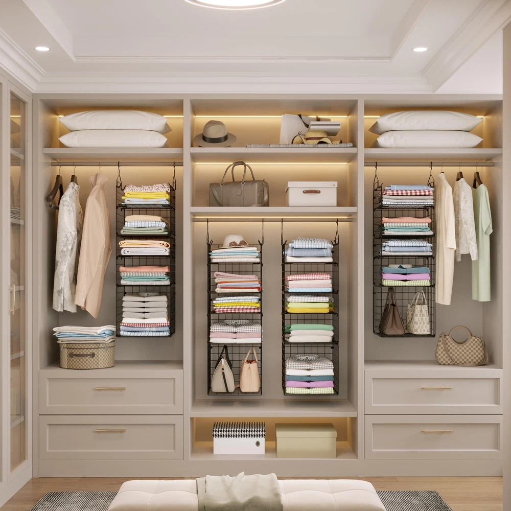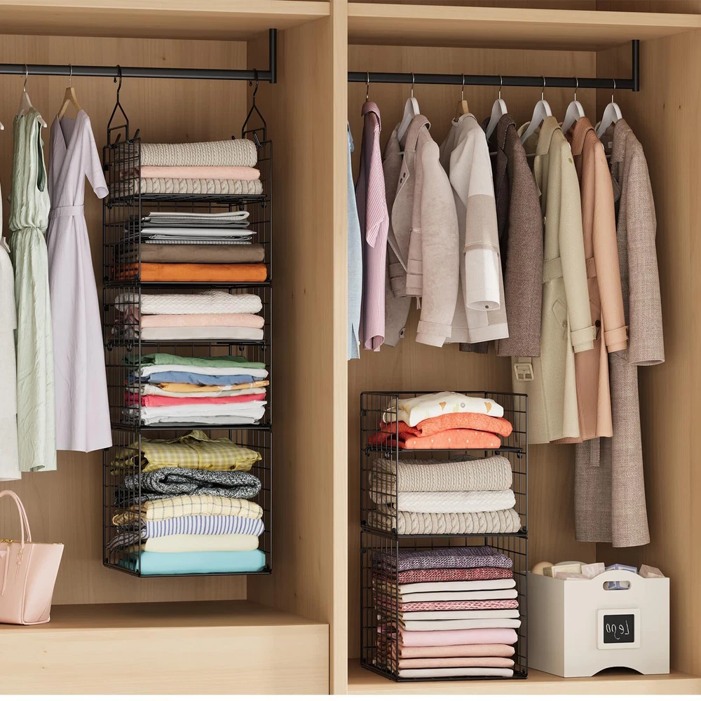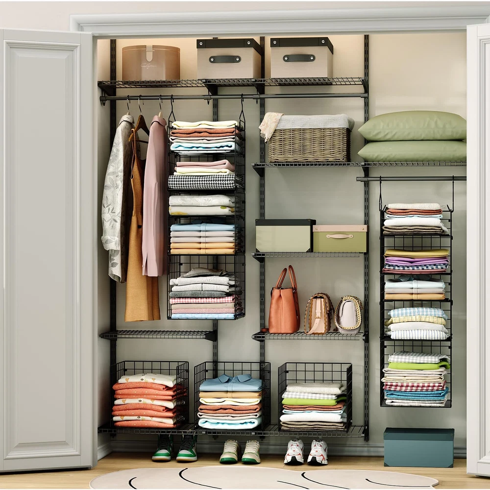 【Large Capacity Organizer】The 5-tier adjustable closet organizer and storage hanging basket provide more space, and keep clothes from dolls,socks and etc, making wardrobe neat & tidy. 【High Quality & Heavy Duty】This hanging closet organizer is made from high quality carbon steel, durable, stable, bearing 35 lbs without deformation. 【Versatile Uses】Collapsible metal hanging closet shelves are suitable storage baskets for bedroom,closets, laundry room, play room, college dormitory. 【Space-Saving】Vertical format design maximize the use of closet space, and the closet organizer hanging shelves perfect garment organizer without taking up any additional floor space. 【Easy to install】The wire closet organizer shelf is simple installation. Just hang on closet rod, no hardware needed. Removable and collapsible rack won't take any space to .