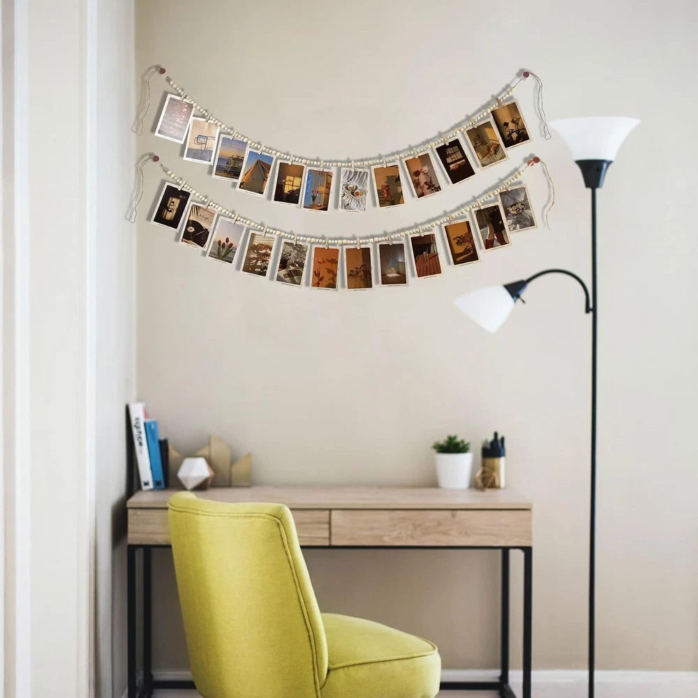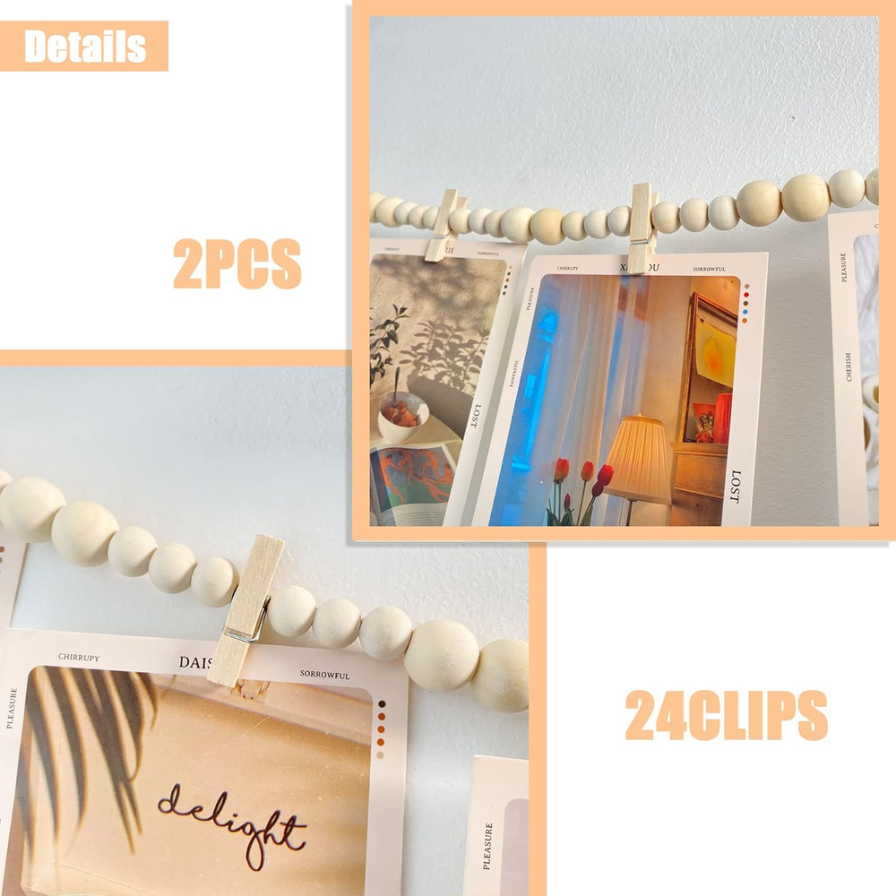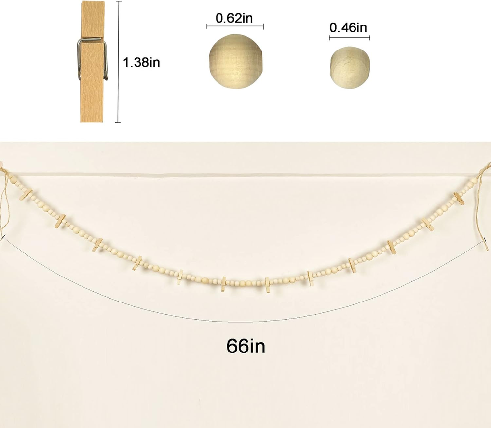 FIT SIZE: The total length of the photo card holder is 66in. threaded by 2 different sizes of beads, big beads 0.62in, 26pcs, small beads 0.46in, 72pcs. This length is enough for you to decorate your living room, bedroom and other places. New Design: Wooden bead garland wall photo clip one with 12 clips, received 2pcs. clips are fixed in the middle of the beads, can not be removed. Natural Material: Hanging photo clip overall using natural wood beads and jute rope handmade, strong, durable. Wide Range of Uses: Hanging photo display with clips can be used to display the beautiful moments in life, you can use it for official photos, postcards, paintings, children's artwork, greeting cards, anything you want to post to display cards can be used. Gift: Photo String with Clips can add boho style, farmhouse style to your home. You can give it to friends, family, as a gift for housewarming, party, Christmas, Mother's Day, Thanksgiving and other occasions. Product description Hanging Photo String with Clips JiTiMi photo display with clips can display photos, artwork, greeting cards or other size cards. Design Different Styles You can use your creative abilities to design photo strings with clips and make them your own style. 2pcs Photo Display with Clips You can use the 2 photo display with clips for wall together, but they can also be displayed separately.