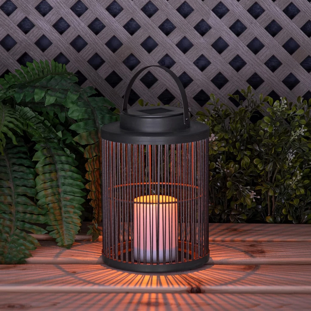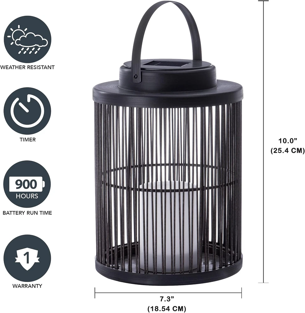 Hanging Rattan Basket Solar LED Light Flameless Candle Lantern, 10.0", Black