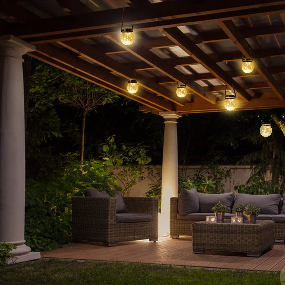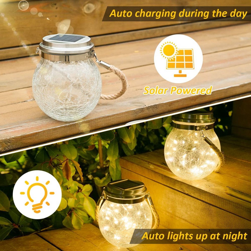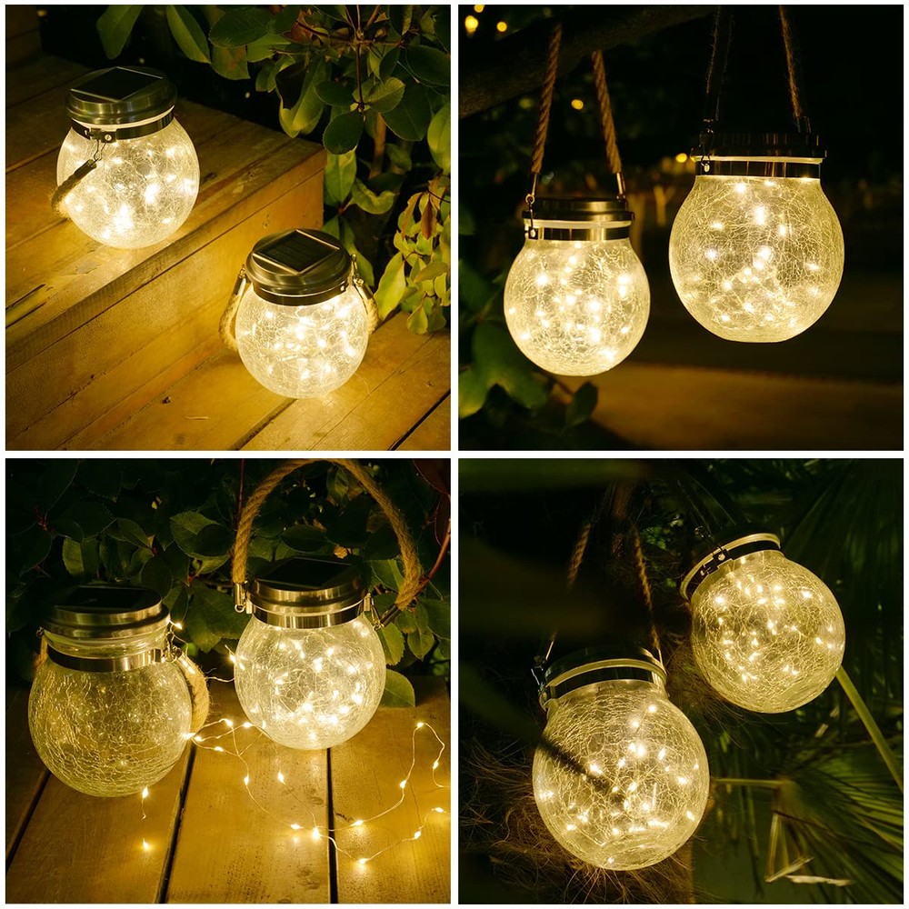 【Innovative Gift & Beautiful Decorative】Cracked glass design with 30 warm LED. Solar outdoor lights garden have soft and beautiful light. Hanging solar lanterns outdoor creates a romantic and relaxing atmosphere for your family or friends.Wonderful decoration for your garden, patio, backyard, lawn, tree, pathway, courtyard, and party 【Solar Powered】 Solar Hanging Lights Outdoor has a powerful power storage function. Garden decor is charged wireless for 5-8h during the day and used for 8-10h at night automatically without extra electricity. Please install the solar lights in a place where the sun can directly shine 【Weather-Resistant】The Outdoor Solar Lantern decoration is made of high-quality transparent glass and stainless steel. IP65 waterproof Solar Easter Lights decor outside can withstand snow, sun, dampness, wind, rain, and extreme temperatures. Before first use, please use your hand to cover the solar panel, and press the switch button to see if the Hanging Lanterns Garden Solar Lights for the patio light up 【Widely Application】Outdoor fall decorations porch can be hung by a rope handle, or placed on a table, step, etc. Solar Lights Outdoor for garden, patio, balcony. Lantern decor adds atmosphere to party, wedding, and birthday 【】Our goal is 100% customer satisfaction. If you have any questions about decoration solar lights outdoor , please feel free to us. We promise to be responsible for our customers and our products