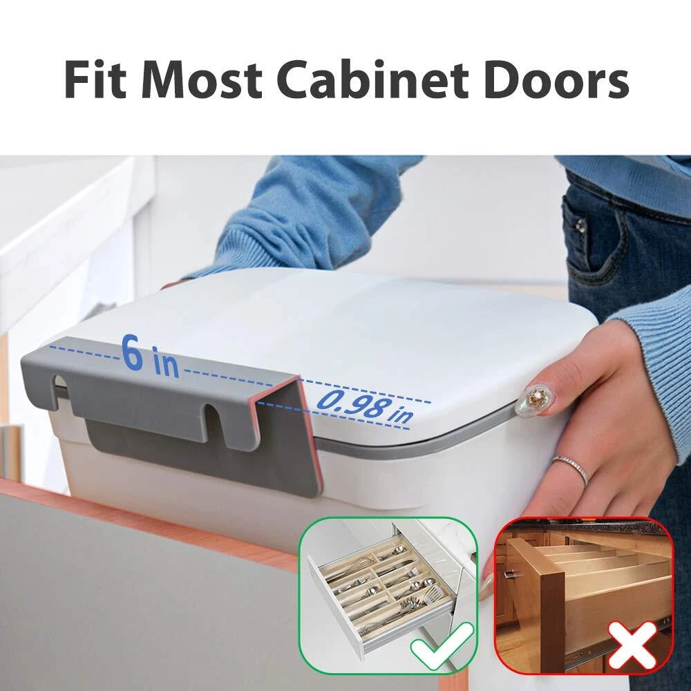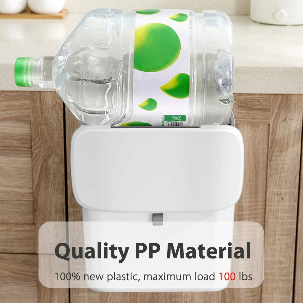 Upgraded Kitchen Hanging Trash Can: Two ways open (slides forward or flips up) Two installation methods (hangs on bracket or mounts on adhesive hook.) Excellent sealing Scraper included Package Include: 1x Trash can 20x Garbage Bag 1x Scraper 1x Hook 1x Adhesive Hook Specifications: Material: 100% New Plastic Size: 11.8*10.4*6.5 inches Volume: 2.37 gallon (9L) Weight: 1.32 lbs (0.6kg) Hook spacing: 0.98 inches (2.5cm) Hook length: 6 inches (15.24cm) Height difference between lid and hook: 0.59 inches (1.5cm) Adhesive hook size: 6.3*2.5 inches Color: White Gray 12 Months , Friendly , Solve Problems Quickly and Easily for You within 24 Hours. Note: 1. Please confirm the thickness of your cabinet door before purchasing (Less than 0.98in). 2. The thickness of the hook is 0.1 inches (0.025cm), which may cause some cabinet doors (the gap is too small) can not be closed, please confirm before purchasing. 3. Adhesive installation: clean the surface, press the adhesive hard to squeeze out the bubbles, wait 30 minutes before hanging the trash can. (Can be used on a variety of hard and smooth surfaces, not easy to peel wallpaper or walls or any rough texture surface) 【New Design】 The trash cans hanging above the cabinet doors save you from having to walk next to the large trash cans and save your kitchen space. The new sealing lid design can effectively reduce the odor and fruit flies in the kitchen. 【Flexible Installation】 Provide two installation methods: door hanging + wall-mounted, suitable for most cabinet doors and smooth walls. 【Quality Materials】 Excellent sealing, high-quality polypropylene, 100% new plastic, no odor, different from other fragile products, can bear more weight. 【Multipurpose】 It works well with reusable grocery plastic bags. It is also suitable for bedrooms, bathrooms, RVs, and can be placed flat on the ground. 【Customer Satisfaction】 We promise you every quality hanging trash can and friendly . If you found the hanging garbage can you received is defective or any problem in using, please feel free to us.